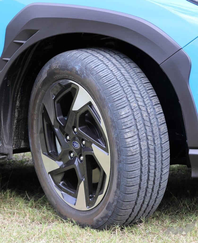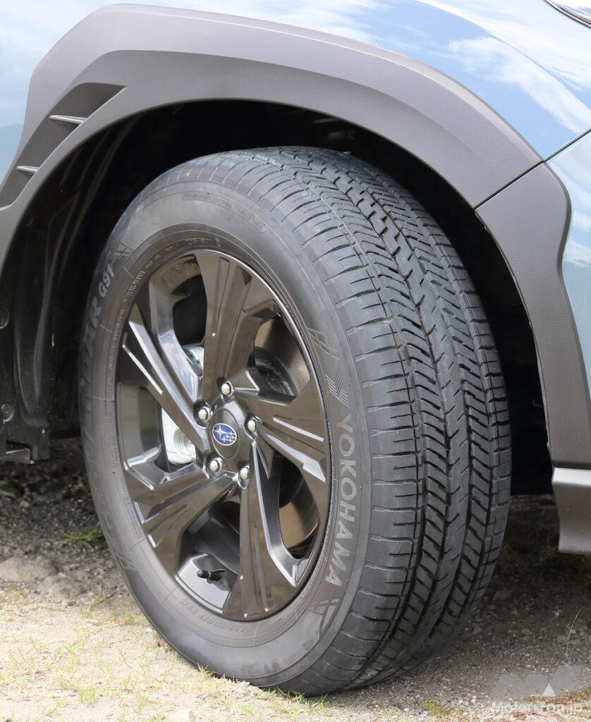 タイヤサイズは18インチが225/55R18でファルケン・ジークスZE001A A/S(撮影車)、17インチが225/60-R17のヨコハマ・ジオランダーG91(撮影車)。XVのサイズは225/55R18。18インチ、17インチどちらもXVからサイズの変更はない。