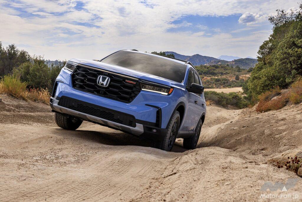 新型パイロットのエクステリアは、直立の大型グリル、力強い水平ベルトライン、フェンダーフレアデザインなど意欲的で冒険的なデザインを採用した力強いスタイルに一新。Aピラーが後退しロングノーズ化したことでよりスポーティなシルエットに確立されている。水平基調のベルトラインは86mm長くなった全長を強調し、ロングホイール、ワイドトラックにより、より強くアグレッシブな存在感を示している。リアビューは、ルーフスポイラー、ルーフレールとLEDテールライトが印象的で、一目で4代目パイロットと分かるスタイルになっている。
