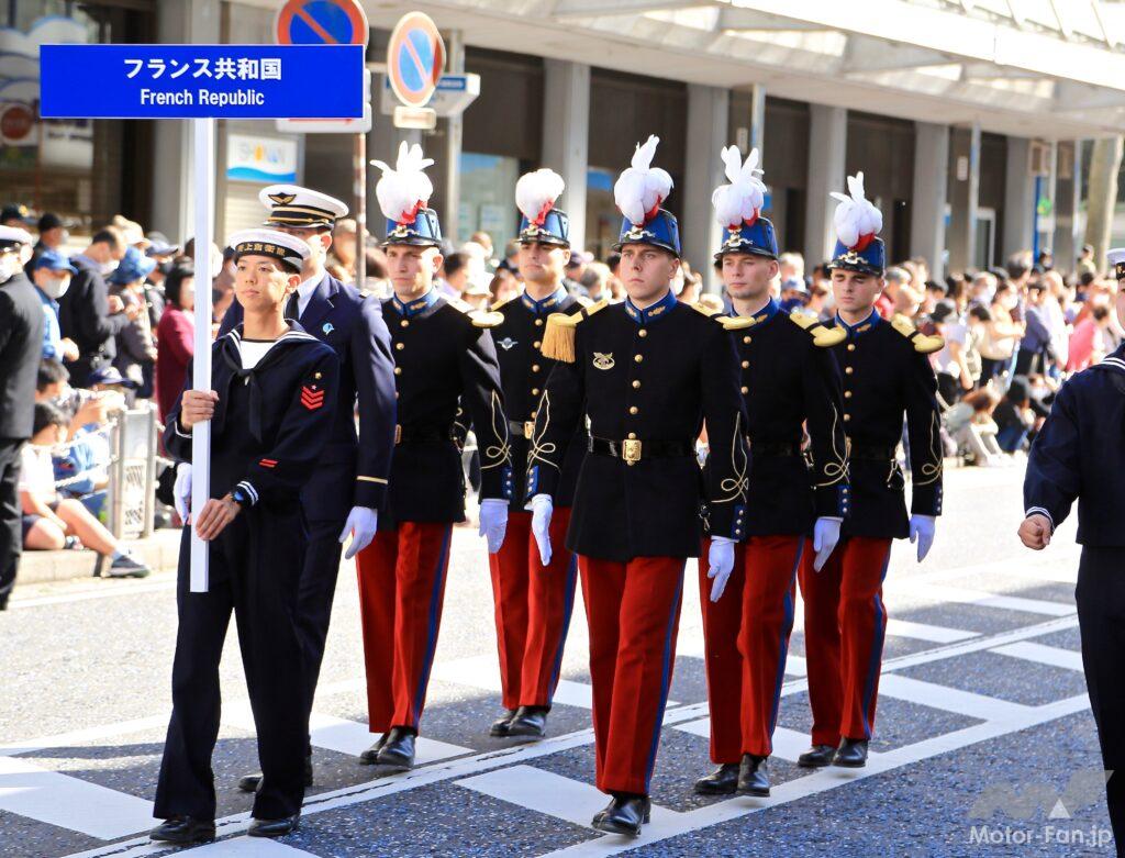 同じく「よこすかパレード」でのフランス海軍。黒と赤の上下に羽根飾り付きの帽子が素敵です。航空機1機と、少数人員での参加だったが、この行進は印象的だった。