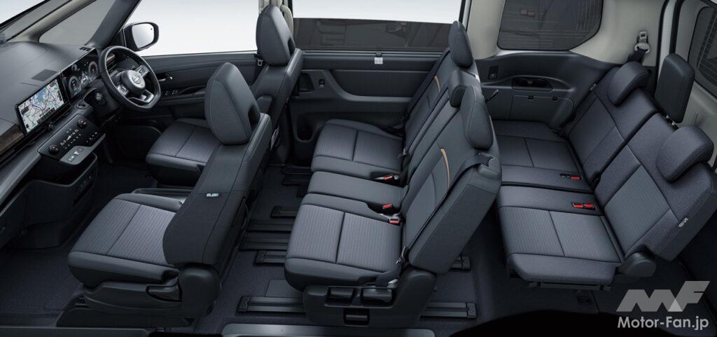 第2世代のe-POWERと高剛性サスペンションにより、車体の動きはなめらかで、新開発のシートは車体の揺れの伝達を抑え、クルマ酔いにつながる頭の急な揺れを抑制。また、アクセルペダルだけで車速を自在にコントロールできる「e-Pedal Step」の操作性も向上させた。さらに、高剛性ステアリングの採用により操縦安定性を高め、ミニバンが苦手とする横風を受け流す車体構造によりふらつきを抑えることで、高速でも安定した走りを実現している。加えて、見晴らしがよく開放的な視界や、最適な位置に配置された後席専用モニターなど、視覚的にもクルマ酔いの低減が図られている。