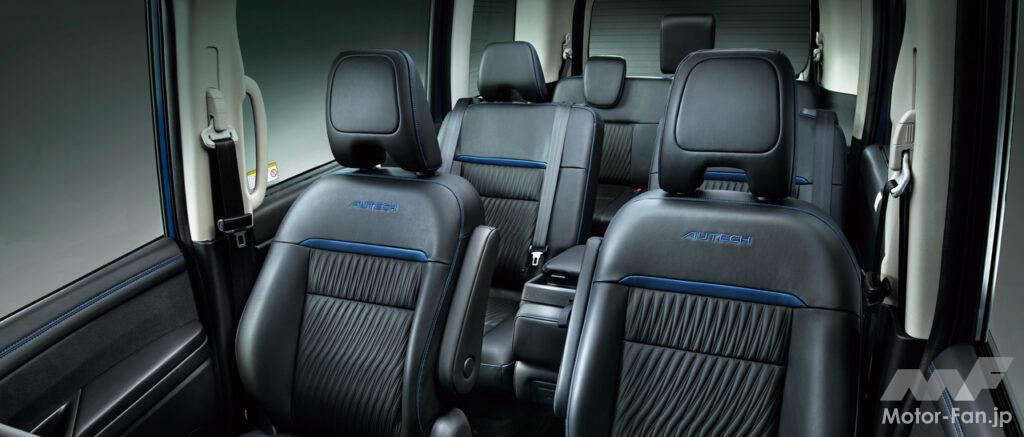 インテリア全体はブラック基調でコーディネートされ、ステアリングホイールやシート、ドアトリムなどに、AUTECHブランドを象徴するブルーステッチが施され、スポーティかつエレガントな空間を演出。なお、e-POWER車はセカンドシートに「キャプテンシート」を採用(AUTECHのe-POWER車は7人乗り)し、快適性をさらに向上させた。