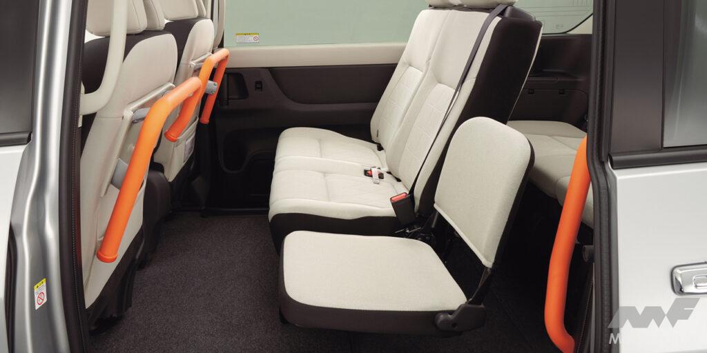 福祉施設や病院などの送迎時に、利用者がスムーズに乗降ができるよう工夫を施した車両。2列目に専用形状シートを採用し、助手席側スライドドアから3列目シートへの乗降性を向上させたほか、乗降用手すりやステップなどを装備することで、お年寄りや足元に不安を感じる方にも乗降しやすい仕様としている。ステップは、助手席側スライドドアから乗降する方に加え、助手席でも同時に使えるロングステップを新採用し、乗降性をさらに向上させた。