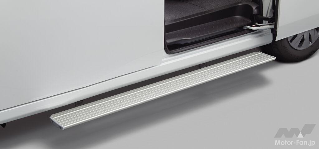 助手席と助手席側スライドドアから乗降する方が、同時に使えるロングステップを採用。助手席ドアもしくは助手席側スライドドアの開閉と連動して、ステップが展開・格納する。ステップイルミネーションも装備され、踏面に加えステップ下の路面も照らすことで、暗い場所でも安心して乗降ができるうえ、LEDの照明がスタイリッシュさを演出する。また、先代モデルに対してロングステップの奥行を拡大し、乗降性の向上が図られている。