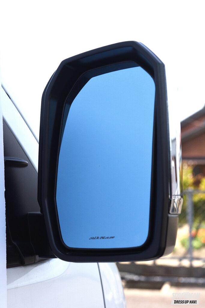 ハイエース用ドアミラーウインカーとぜひとも合わせて使いたいのがウイングミラートリプルモーションエボ。ウインカー動作に連動して鏡面に広げた翼のようなLEDが浮かび上がるのが特徴で、しかもその点灯パターンは通常点滅と2種のシーケンシャルという合計3種から自由に選択できるのがポイントだ。純正ミラーに合わせた車種専用設計で、広角タイプのブルーミラー。ロゴも入る。