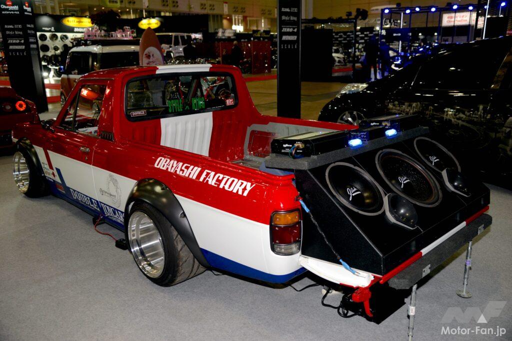 カスタムカーコンテストで数度の受賞歴があるカーオーディオの名門ショップ「尾林ファクトリー」。カーオーディオだけでなくエアロパーツの取り付けからローダウン、さらにはボディメイクまでカスタムなら何でも任せられるショップとしても知られる。さらには旧車についてもこだわりを持ち、近年ではサニートラックのカスタム車両を展示するのが定番になっている。
