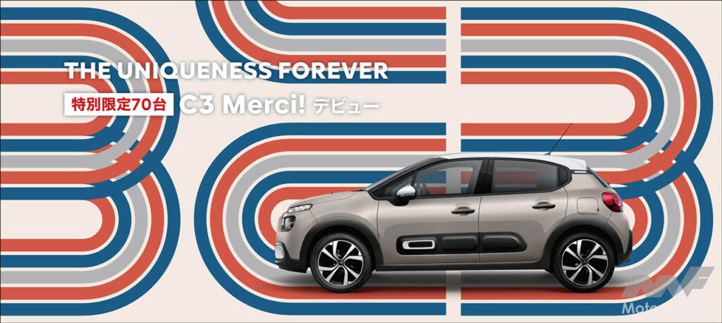 現行のC3は2017年の日本導入以来、約1万台が販売されてきたが、今年4月をもって日本向けの生産が終了した。このたび登場した限定モデル“C3 メルシー!”は、日本で販売される現行最後のC3となる。