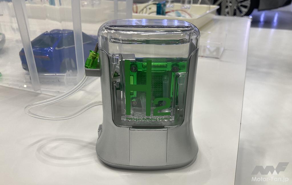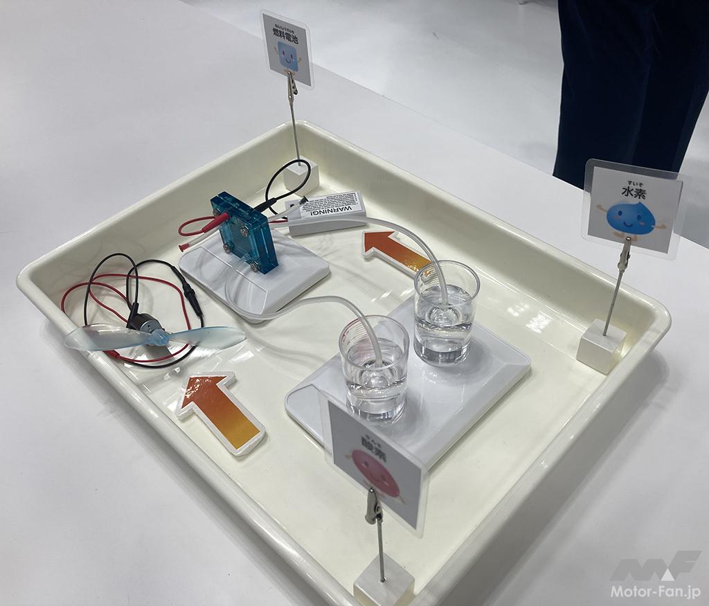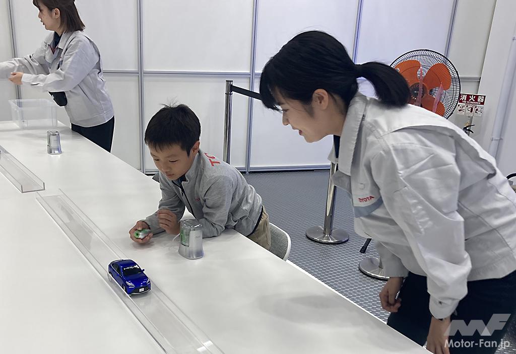 トヨタの研究所では燃料電池車の模型を使い、水素を生成して仕上げはMIRAIを走らせるのです。「ハイブリッドだ、プラグインだ、燃料電池だ」と新時代を告げるカーボンニュートラル提案が矢継ぎ早に提案されて、分かったようで実は消化不足気味だった原理を、こども達がデスクトップで体験します。仲間になってくれる専門家のお兄さんやお姉さんとともに生成した水素をステーション経由でクルマに充填。すると燃料電池車が走り始めます。こども達も保護者も興味津々です。