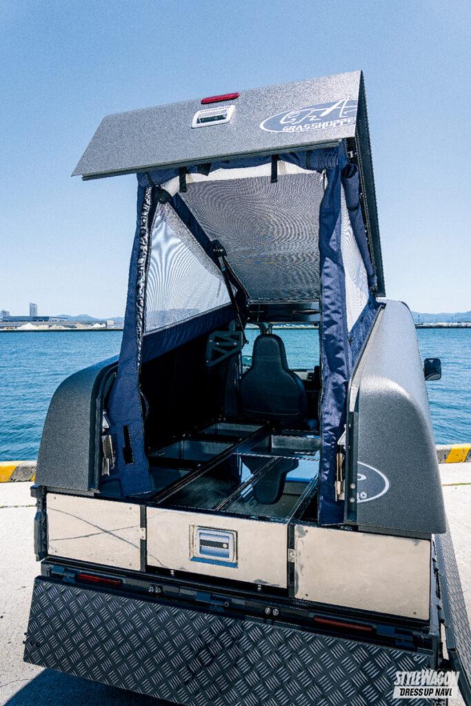 またキャビネットの上にパネルを取り付けることで、キャノピー内はマイルームに早がわり。週末の秘密基地から仕事道具を安全に保管する収納庫まで、使い方の幅も広げてくれる。セミオーダー製作なのでワンオフカスタムにも対応。“見た目も機能性も妥協したくない”こだわりの強いオーナーの願望を満たしてくれるはずだ。