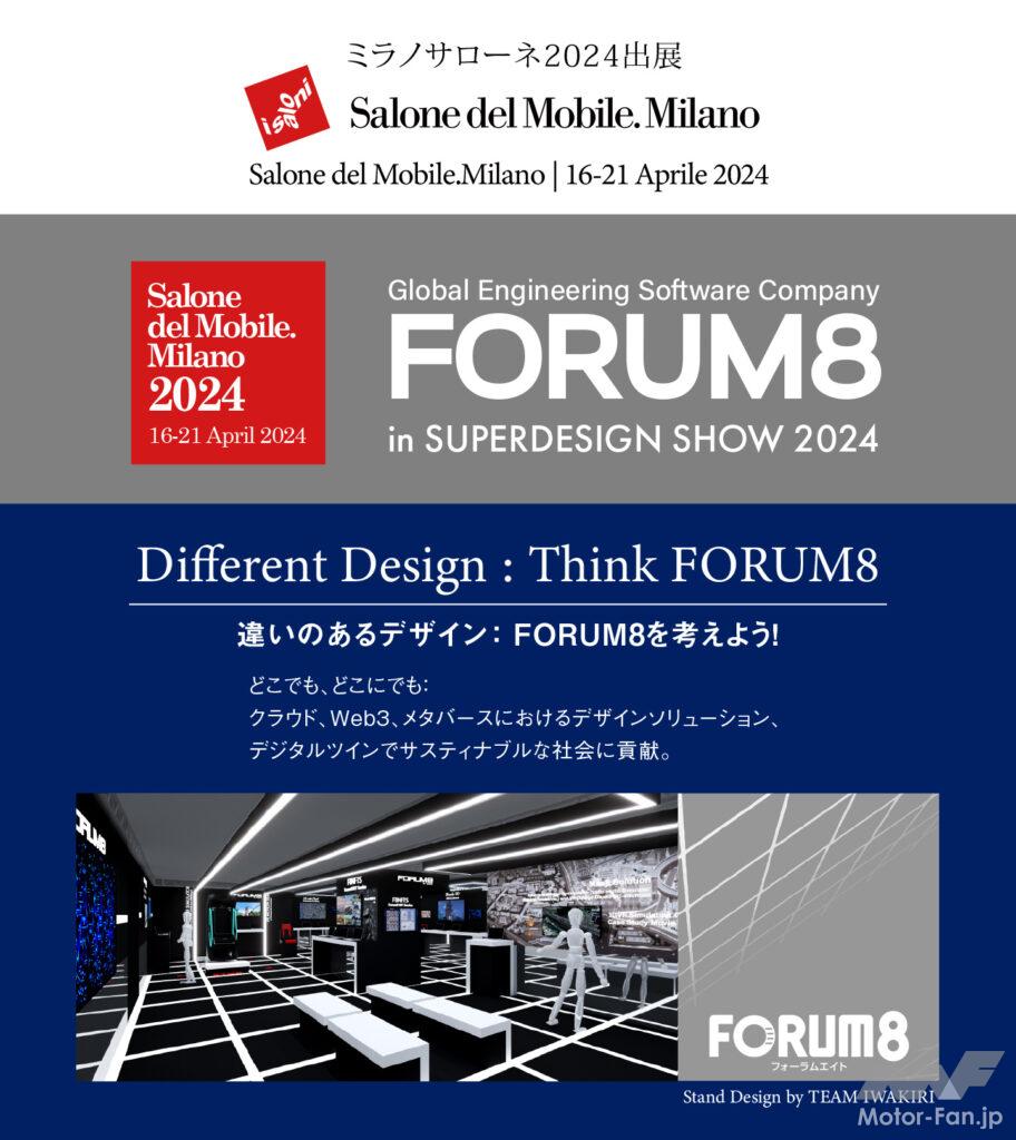 【フォーラムエイト出展概要】 ミラノサローネ SUPERDESIGN SHOW 2024 http://www.superdesignshow.com/ 日時: 2024年4月16日(火)~4月21日(日) 会場: SUPER STUDIO(ミラノ・トルトーナ地区) 出展テーマ: 違いのあるデザイン: FORUM8を考えよう! ~どこでも、どこにでも:クラウド、Web3、メタバースにおけるデザインソリューション、デジタルツインで サステナプルな社会に貢献~