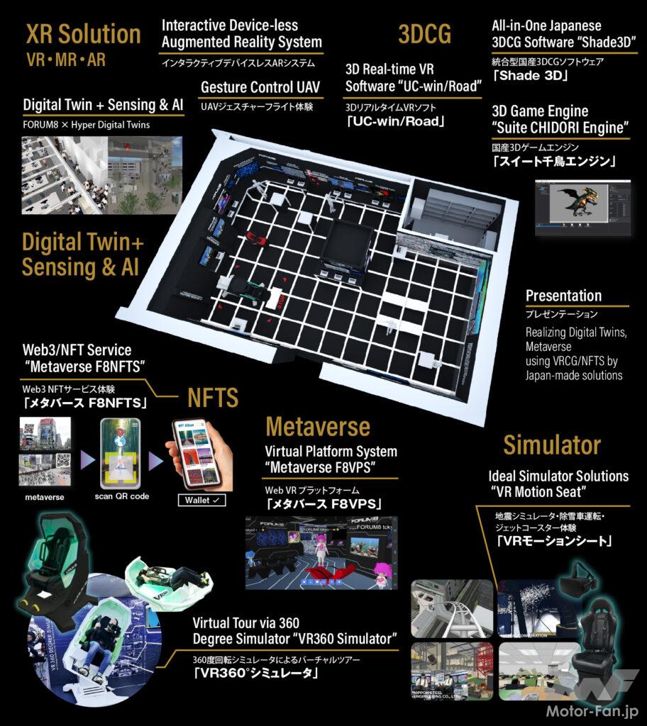 また、多様なVRシミュレーター、ARソリューション、地震シミュレーターおよび避難、火災解析系ソリューションなど、フォーラム8の最新の技術を一堂に展示。さらに、WRCのスポンサーおよびWRC Rally Japanのタイトルパートナーをフォーラムエイトが務めていることから、自動運転シミュレーターなどの自動運転技術も紹介する。IT技術によるインテリア、空間のデザインソリューションに加えて、自動車業界およびモータースポーツ文化に貢献するソリューションも提案する。