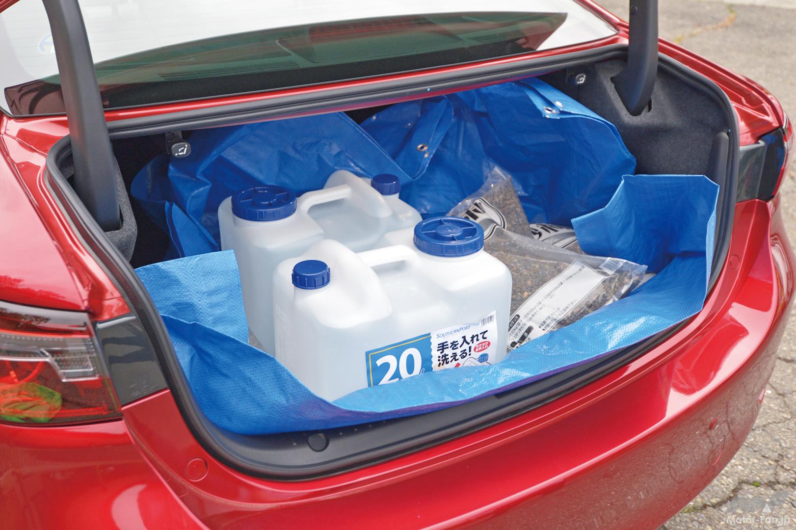 20kgの砂利とポリタンクをあちこち載せ替え、クルマの挙動を確かめてみる
