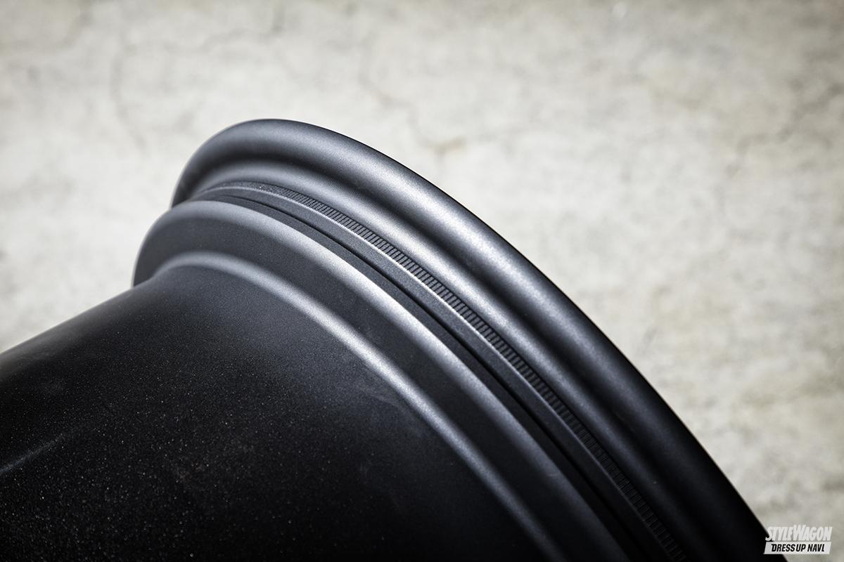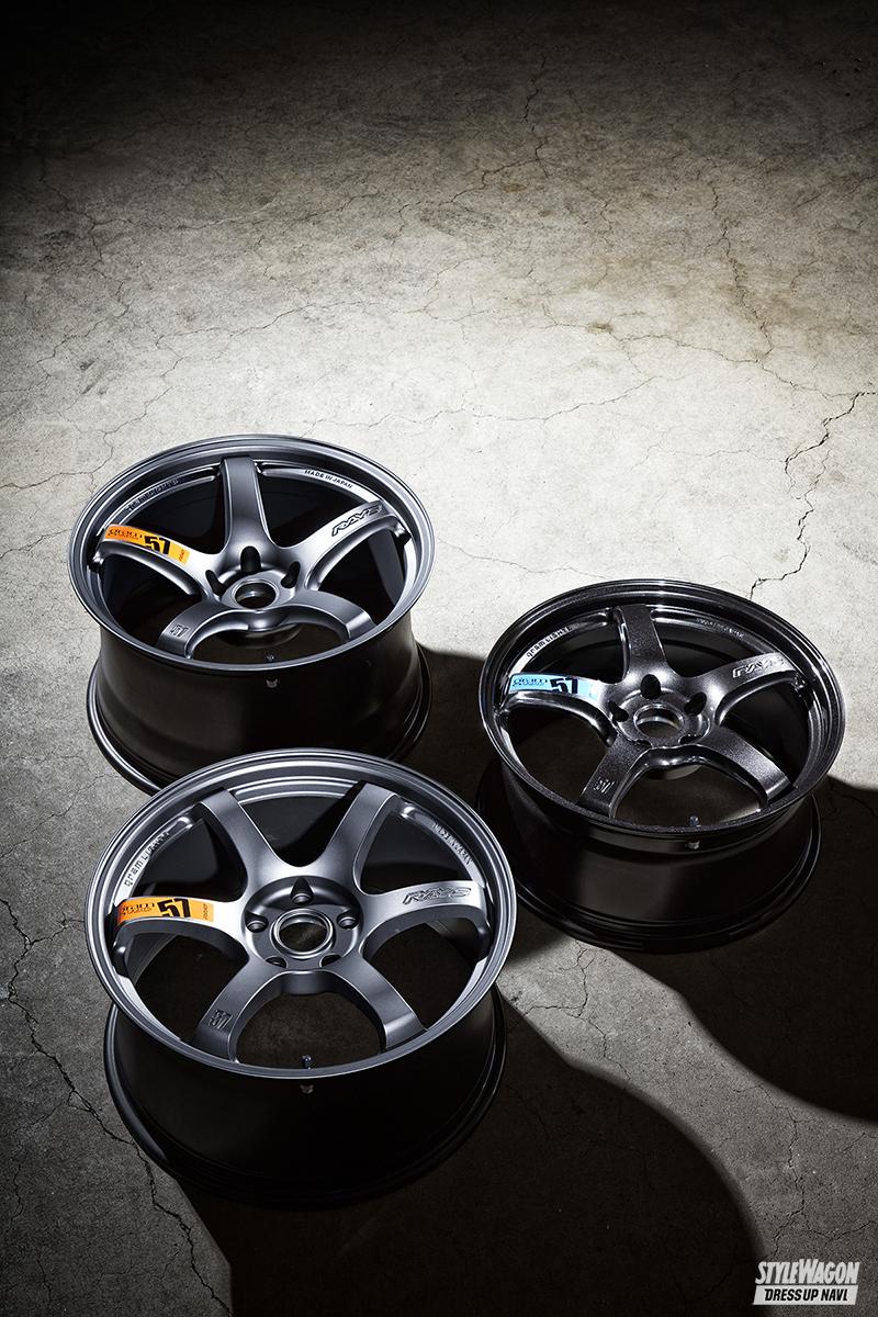 57CRスペックDはドリフト競技を視野に入れたモデルなため、設定されるのは攻めたサイズのみ。そこで同時に発売されたのが、よりマイルドなサイズの履かせやすいストリート仕様、57CRスペックMだ。ディスクカラーはツヤのあるスーパーダークガンメタで、スパルタンすぎず、映え度も上々なフィニッシュを実現。汚れの付着を抑え、汚れてもカンタンに落とせる仕様とするなどメンテナンス性にも配慮した。Dとの差別化のため、ステッカーは洗練のブルーに。