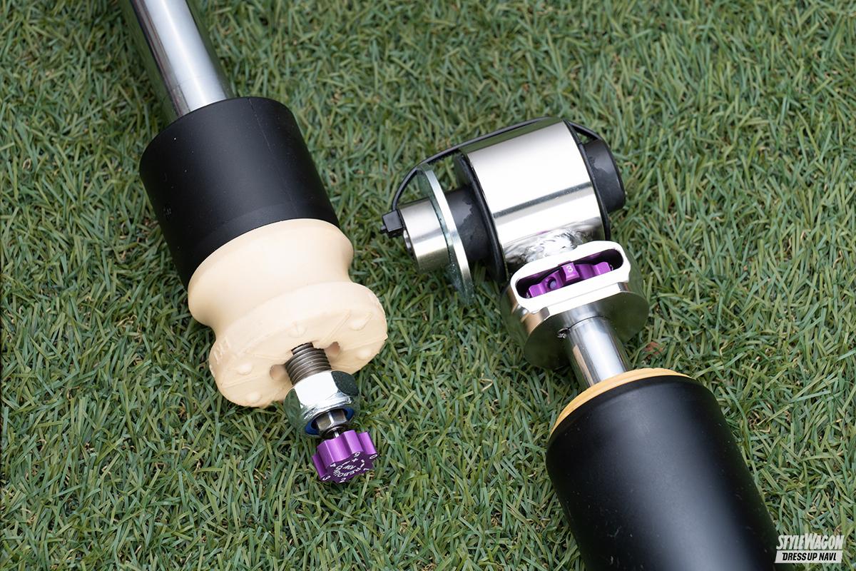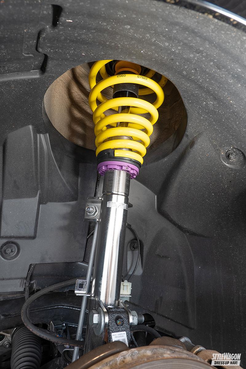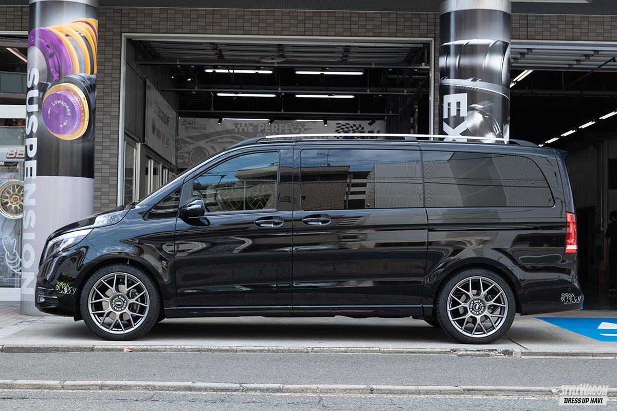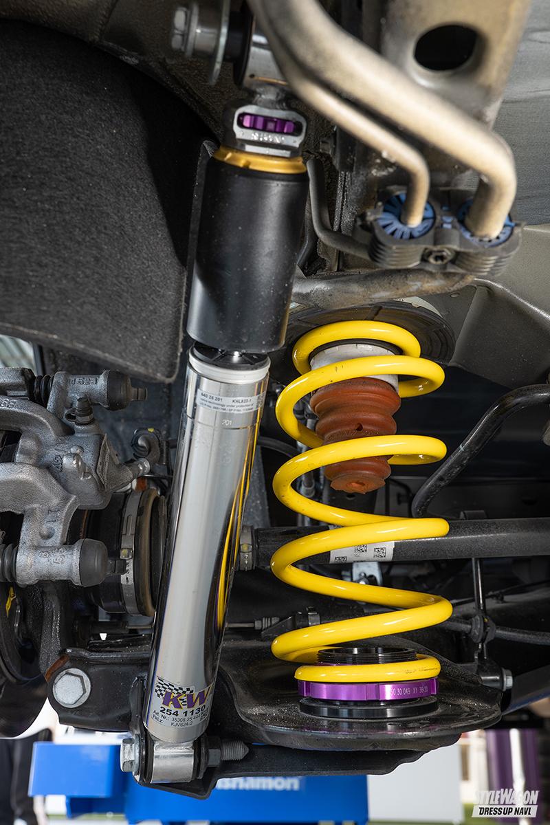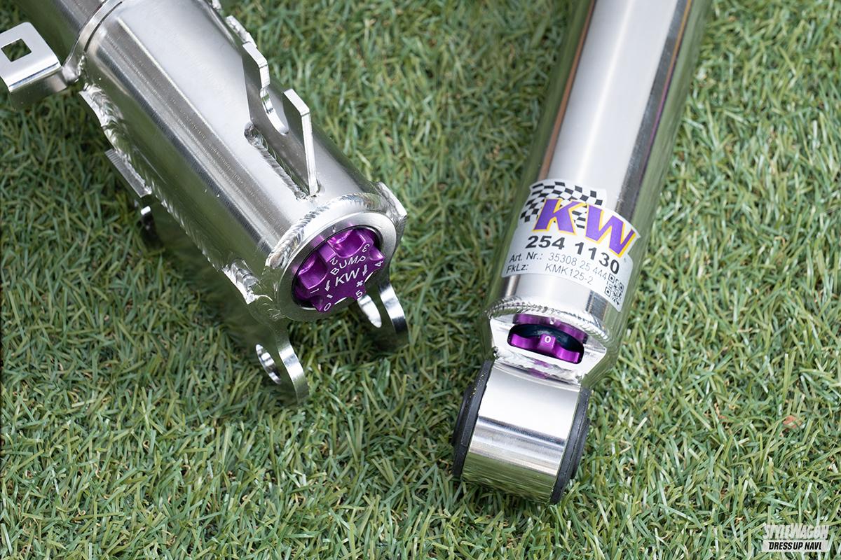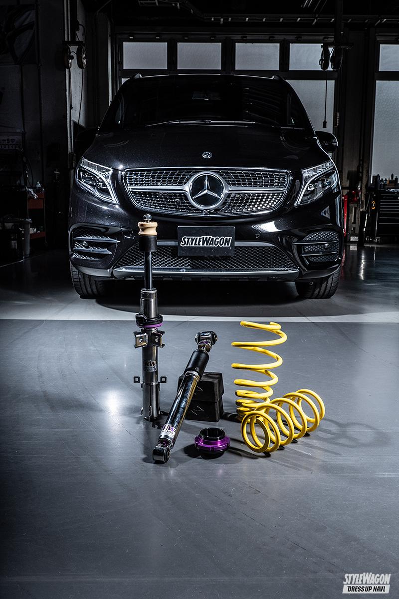 ニュルブルクリンク24時間耐久レースをはじめ、世界のレースシーンで数多くのチームに採用されている信頼のサスペンションがKW。KWの車高調は、サーキット走行向けの「トラックパフォーマンス」、ストリートからサーキットまで対応する「ストリートパフォーマンス」、ストリートでの快適性を重視した「ストリートコンフォート」の3タイプ。今回装着したベンツVクラスなどの乗り心地や快適性を重視するミニバンでは「ストリートコンフォート」の中でも、減衰力が伸び側・縮み側を別々に設定できる「V3レベリング」がオススメ。Vクラスのサスペンションは、Fストラット、Rセミトレーリングアームという構造で、ノーマルだとミニバン特有のフラつきやフワフワ感が感じられることが多い。V3レベリングを装着することで、フラつきやフワフワ感もなくなり、ロールも適度に抑制され、2列目、3列目シートに座っていても、柔らかすぎず硬すぎない上質な乗り心地を体感できた。KWのV3レベリングは、Vクラス用の場合、車高のダウン量も10〜15㎜と少なめ。ほぼノーマルの車高のまま、ノーマルよりも優れた快適性や操縦安定性を求める方に最適な車高調となっている。
