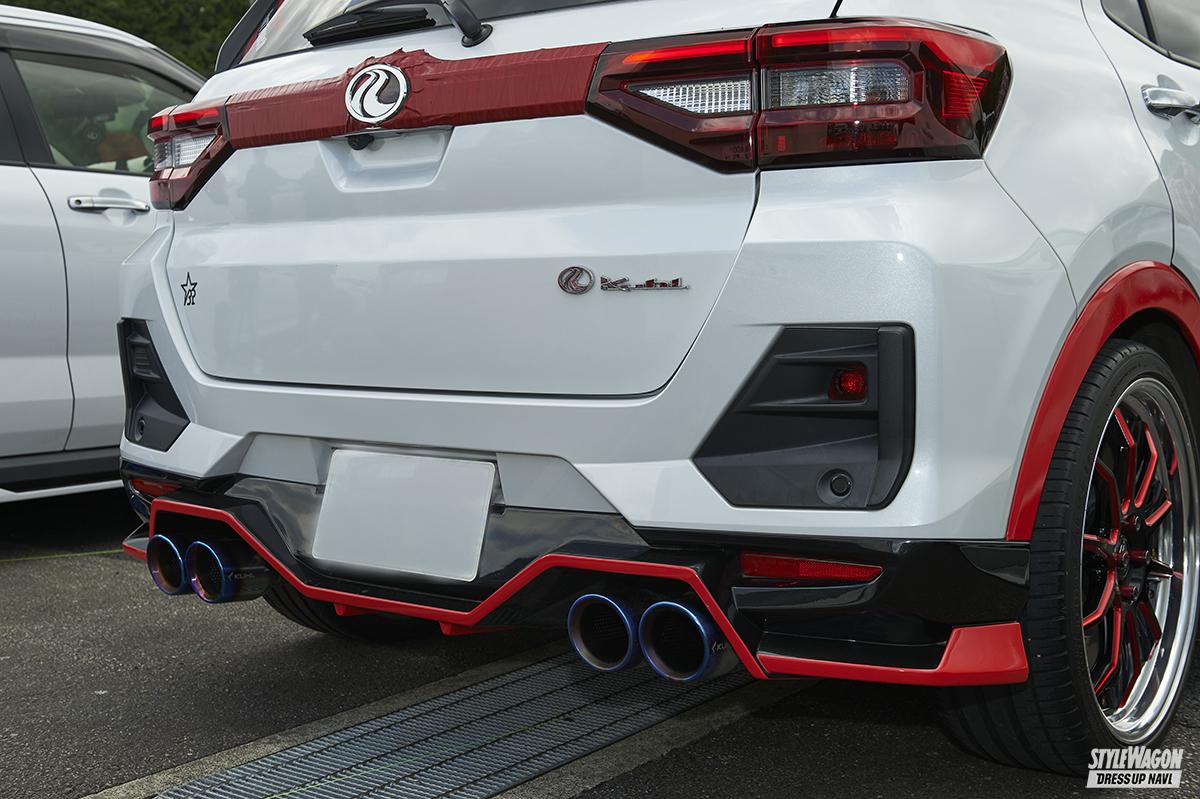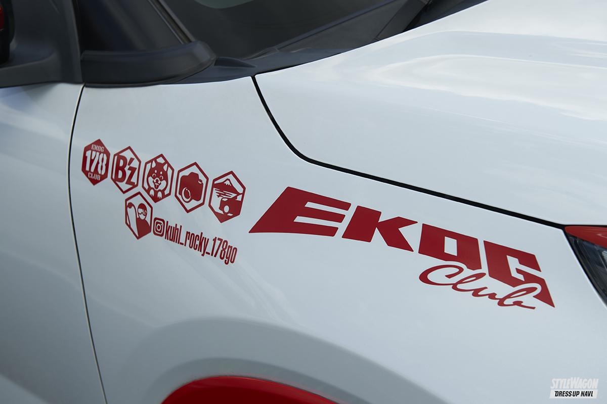 クールのパーツカタログを見てもダイハツ ロッキーの文字は見つからず……。オーナーはヴェルズホイールズを履き、互換性のあるライズ用リアスポイラーを転用フロント&サイドは純正エアロ+リップ。加えてラッピング等を駆使。鮮やかな赤を挿し色にすることで存在感MAXに仕上げたそう。ライズ・ロッキーの集い『EKOG(イケオジ)club』のステッカーも赤仕様。パーツが少ない中で、アイデアと工夫で“際立つ1台”を完成させたのだ!!