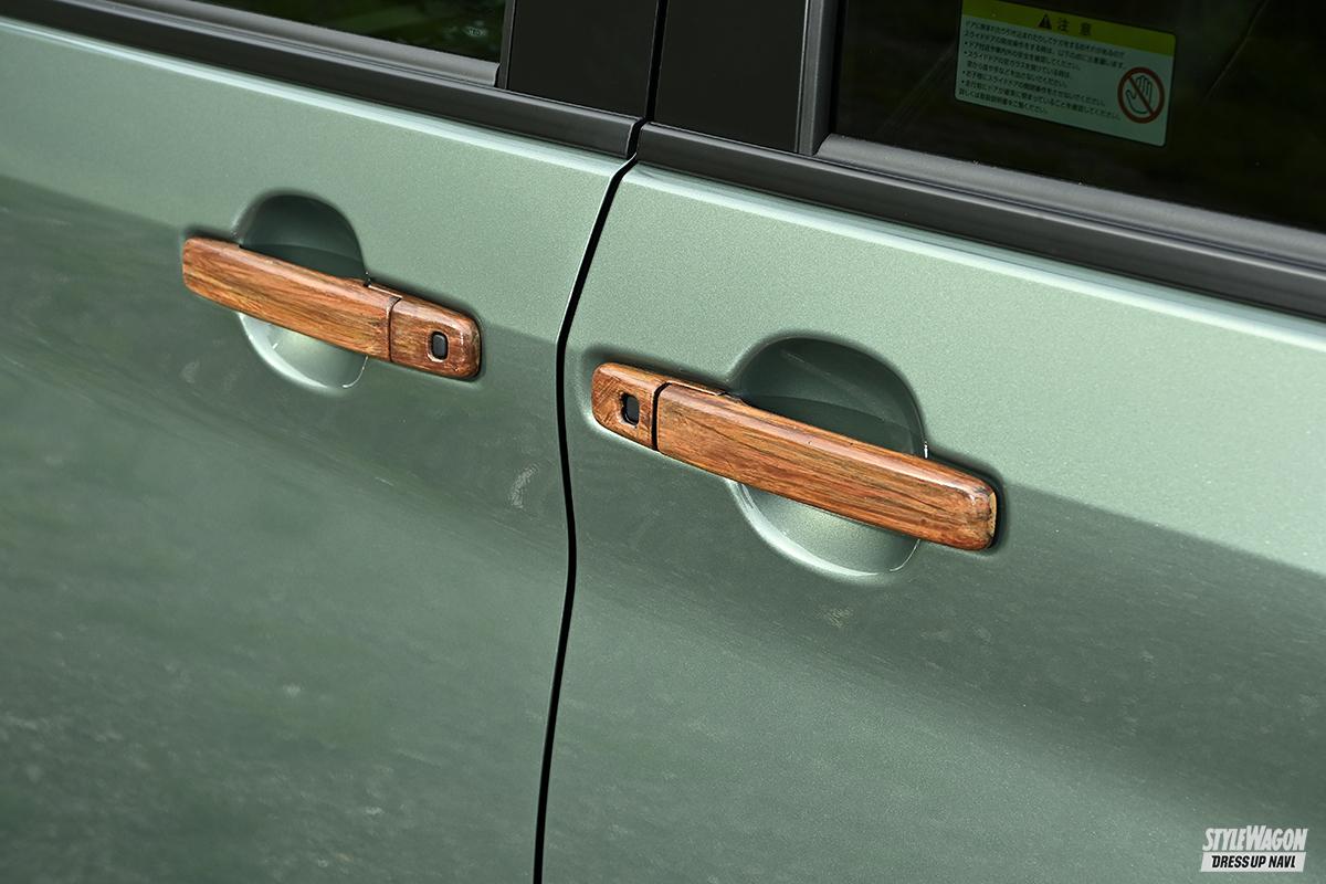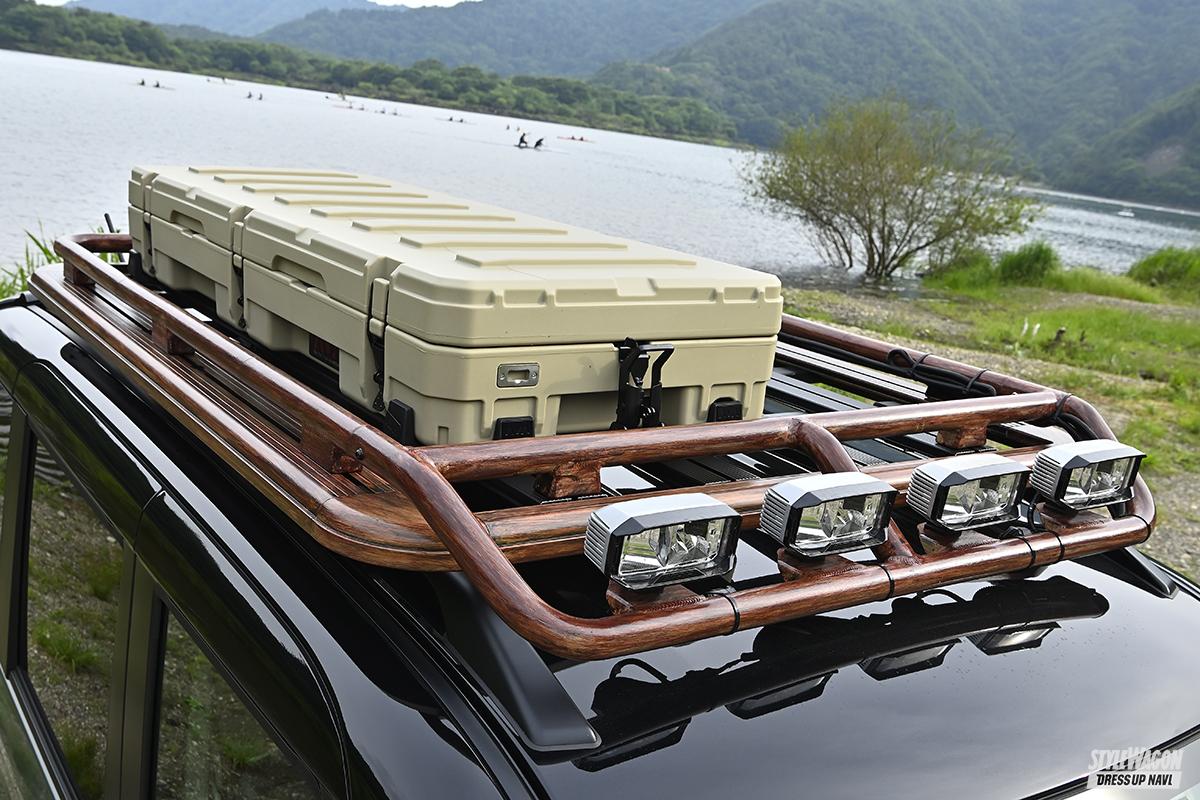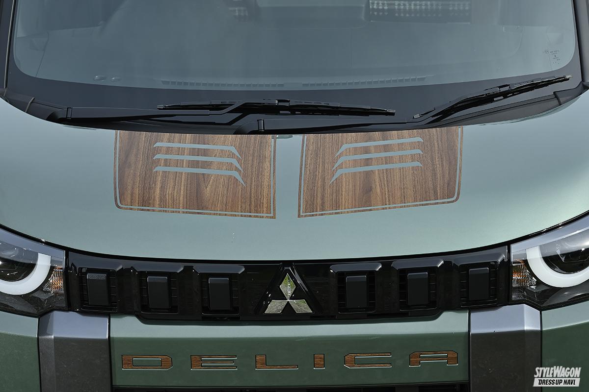 「同じデモカーを作っても面白くないので、とりあえずウッド調でうちのパーツを塗ってみました」と製作されたデリカミニ。DANSHAQ、バスターズルーフラック&リアラダーはワンオフペイント。