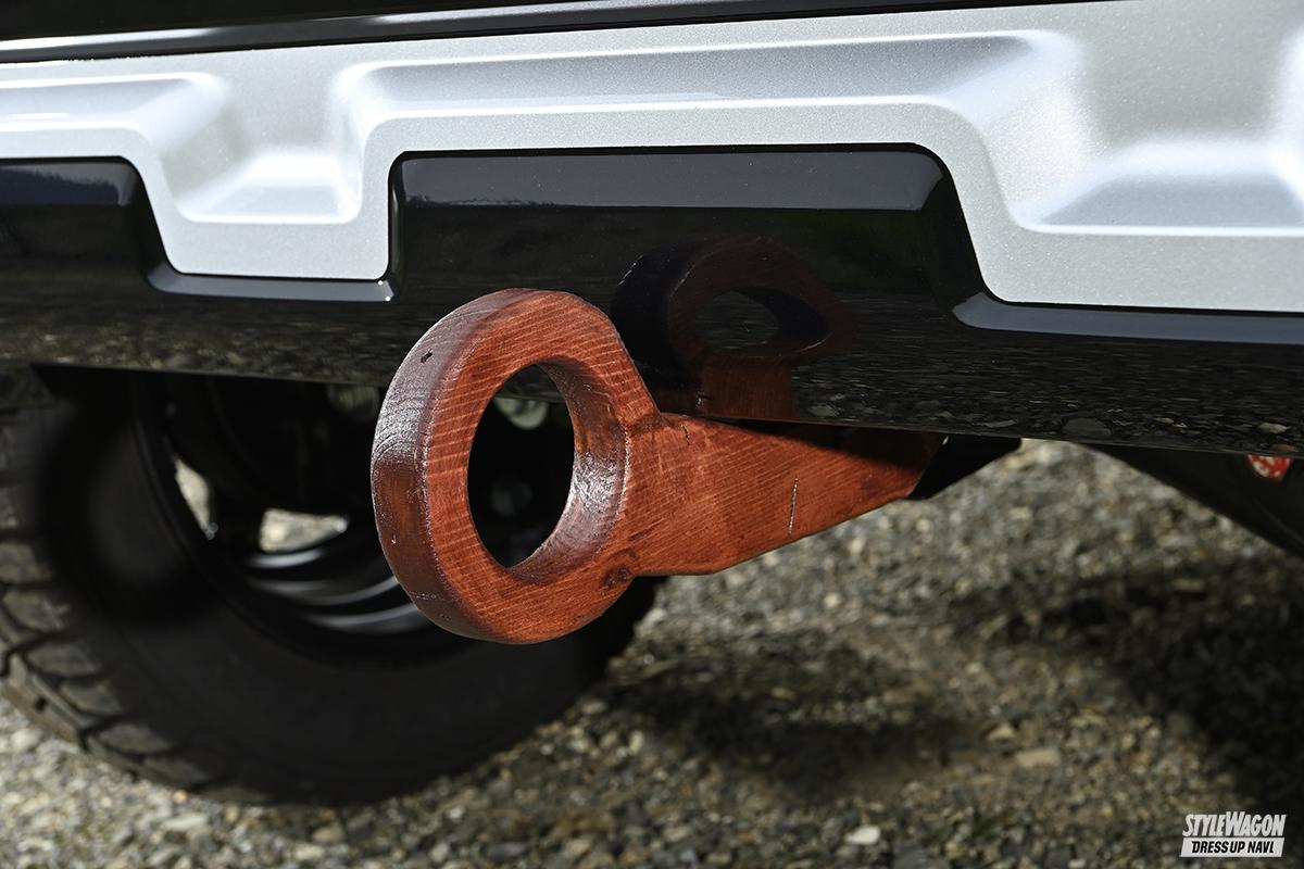 リアに装着されたトレイルフックはリアルウッド!