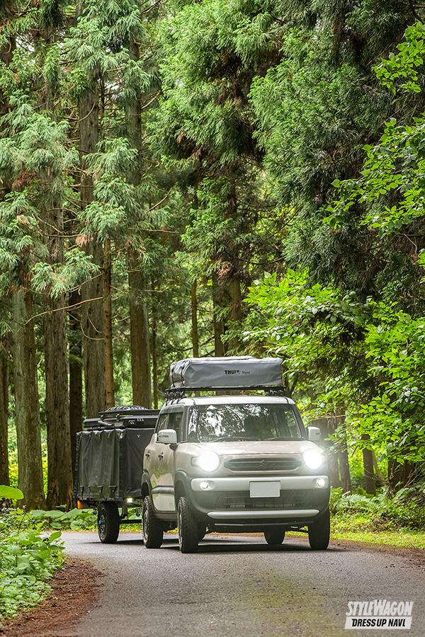 また、クロスビー以上に注目を集めそうなギアが、アウトドア遊びを全開でバックアップしてくれる“ノースハンターT”と命名された多機能トレーラー。剛性感あふれるヤグラの組まれた漆黒のトレーラーは、さまざまなオプションパーツを組み込むことでユーザー好みのギアに仕立て上げることが可能。テントを組み込んだ最上位モデルではクロスビーのルーフトップテントと合わせて5人乗車&5人宿泊キャンプを実現しているのだ。