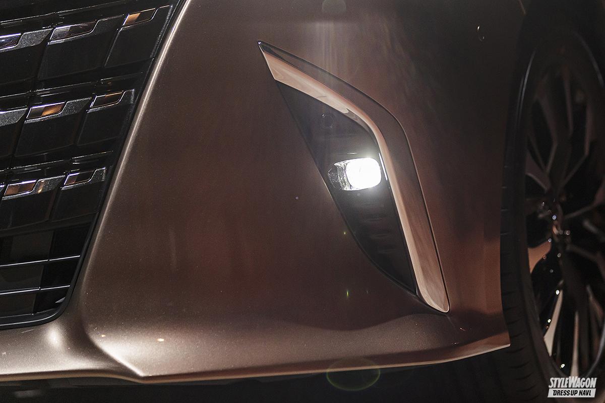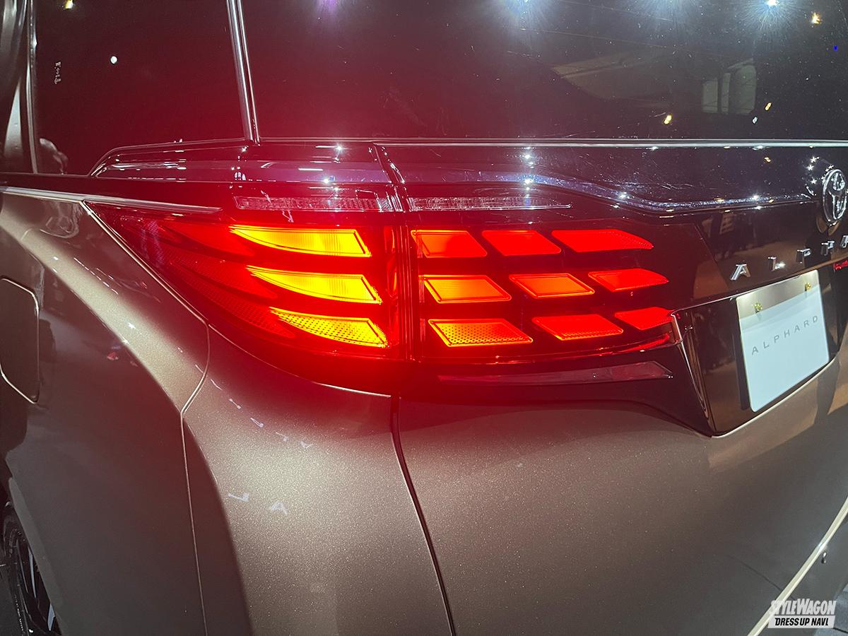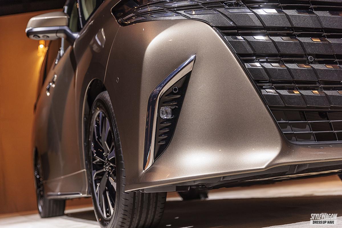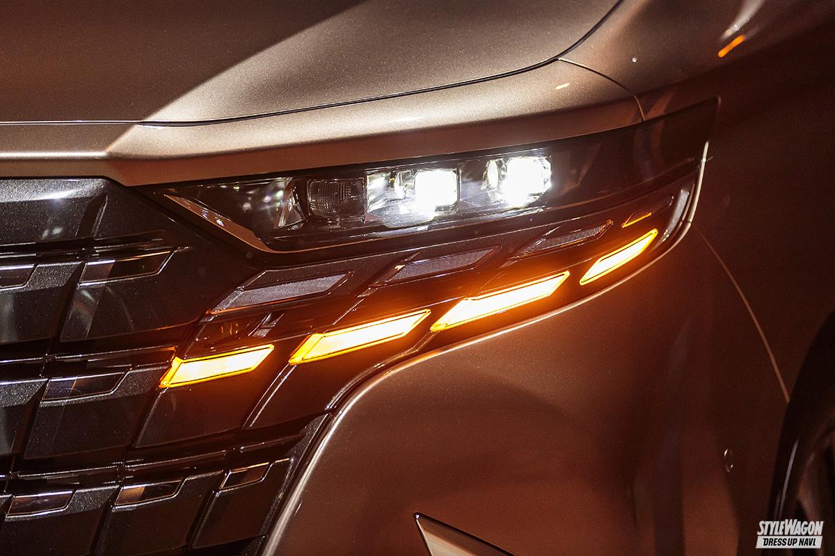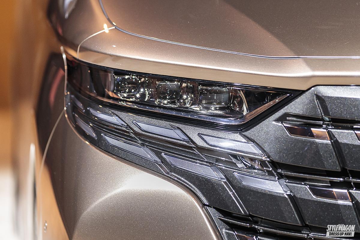 アルファードが他を寄せ付けなかった迫力ある顔つきは、ヘッドライトとの連続性を持たせたことでよりワイドに見えるようになった。グリル部は先代のデザインを継承したブラック×クロームアクセントのコンビネーション。落ち着いた印象の中にも精緻で煌びやかさをもたらしている。