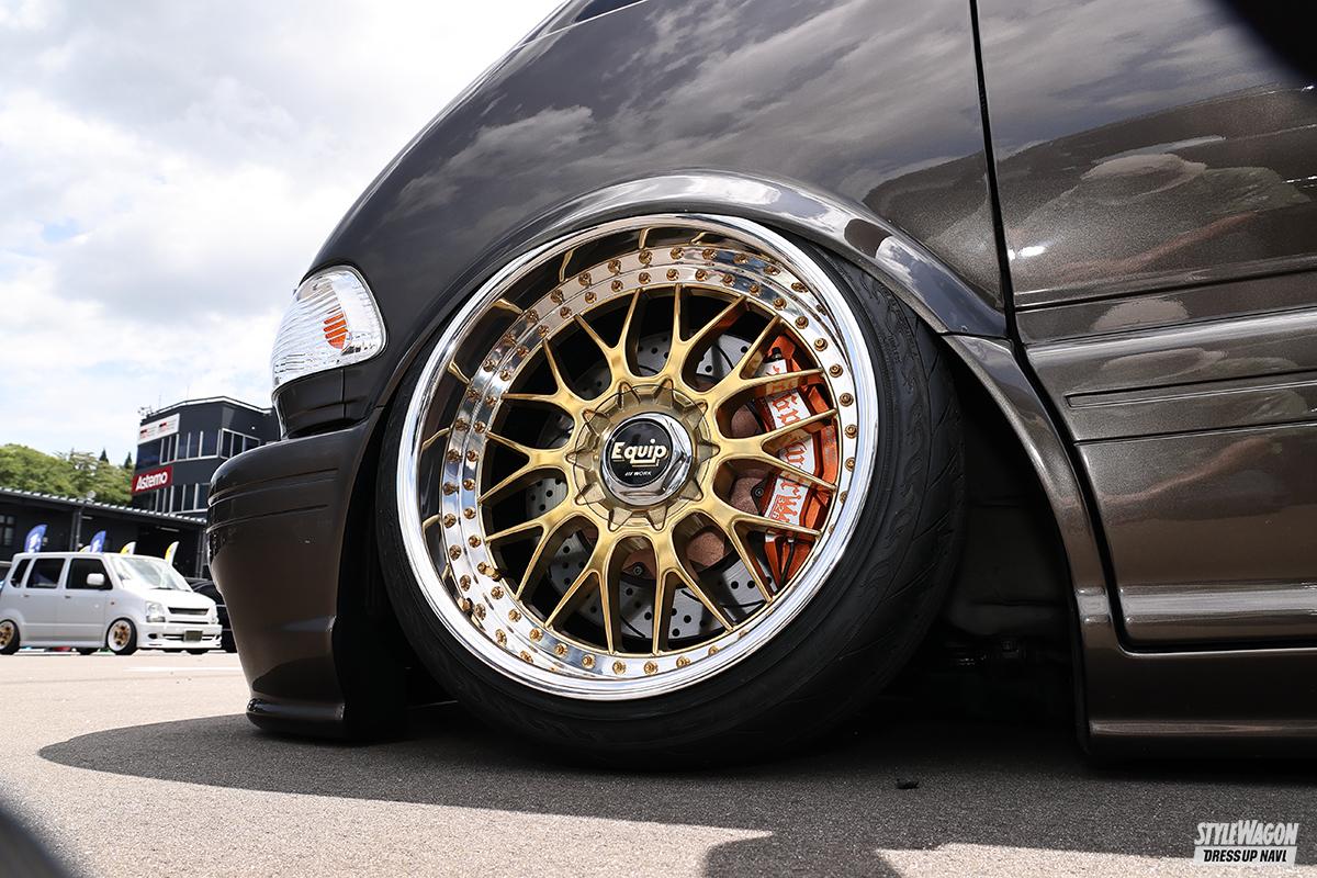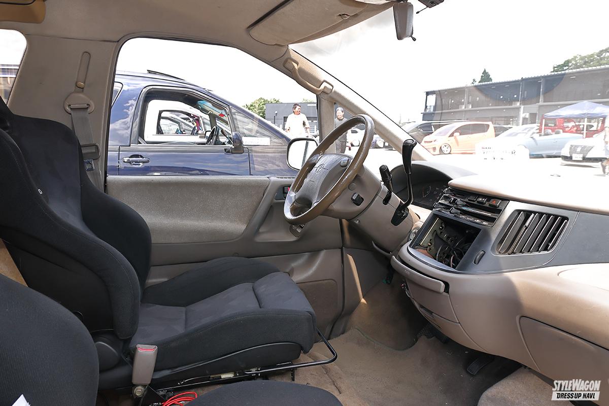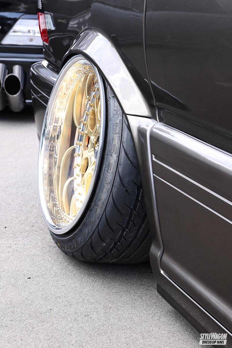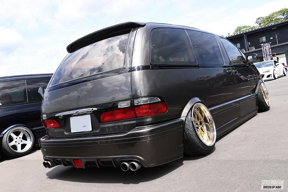 TCRを9台くらい乗り継ぎ、今も家には部品取りも含めて8台のTCRがあるというGP427さん。この日は左ハンドルのプレビアで参戦! カスタムのテーマは「2000年前後、当時のスタイル」。ホイールもそうだし、エアロもそう。そして驚きなのは、エアロの加工のみならず、リアの4独サス移植もDIYで行なっているということ。今後を訊くと、「MT化。ルシ・エミのMTを確保している」との答え。コレもDIYでやるのかな!?