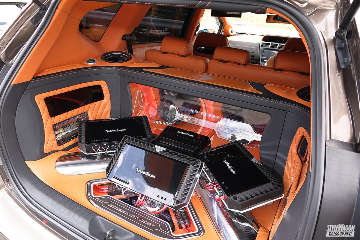 「ちょっとローダウンしてホイールを換えて」と考えていたが、友人に誘われてミーティングに顔を出して状況一変。「(オーディオを含め)自分もやってみたい!」と刺激を受けたのだ。元々ハーフエアロだったけど、段差をなくすべくスムージング。製作ショップはオーディオに強いストリートモンキー。当然映えるシステムを組み込んでいる!