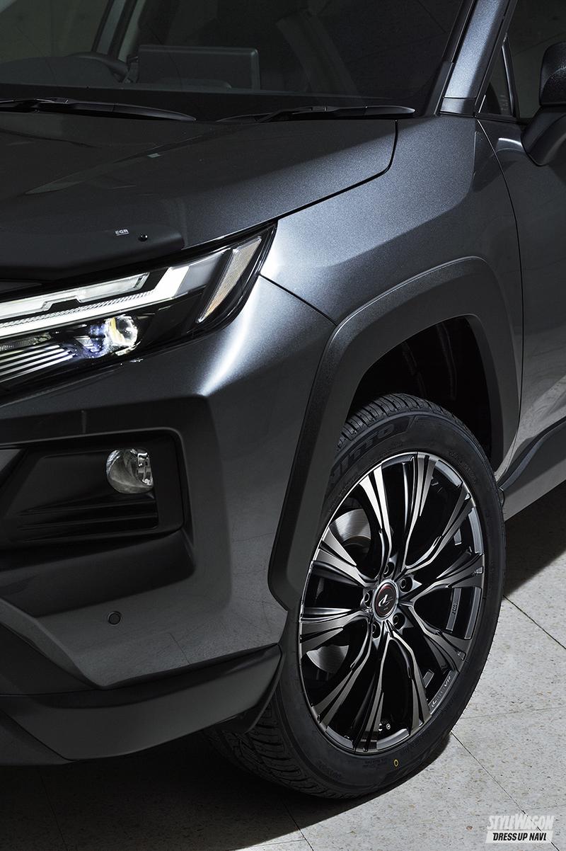 複雑な3D形状で描かれた5組のツインスポークは、まるで生き物のツノのように有機的でパワフル。天面にはスリットが刻まれるからヒネリ感もあって、そのうえ先端がリムオーバーだから足長感も強烈だ。高品位だけど力感が際立つためRAV4のボディサイズとの相性も上々。ローダウンでスタイリッシュにキメるのにも、リフトアップで20インチ履きといったツウな装いにも映えまくりだ。