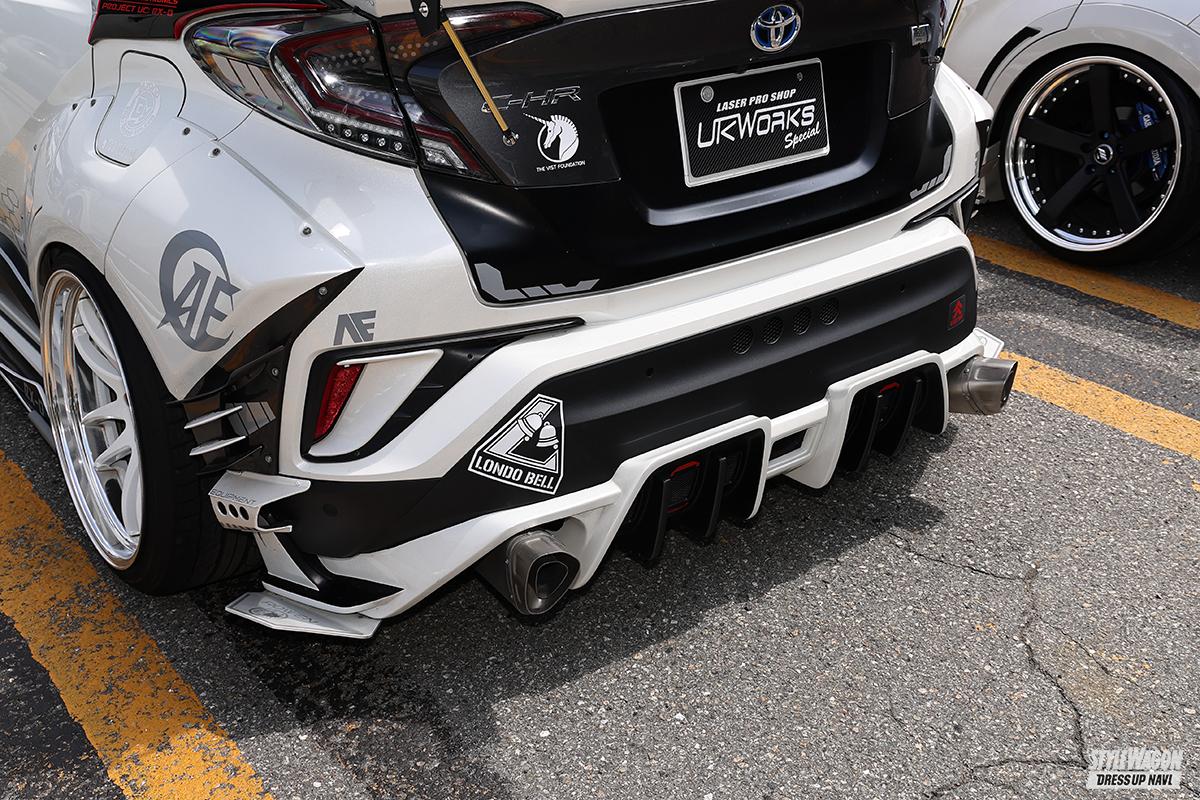 ユニコーンガンダムをモチーフに愛車をセットアップしていったひろき@兄さん。一見チューニングカー、レーシングカーのようなスタイルだが、ステッカーはほぼワンオフ(ガンダム仕様です!)であるなど、細部を徹底的に煮詰めていっているのが特徴だ。C-HR乗りの間では有名な1台だが、さらに足まわりをリメイクしたという。ワイドフェンダー導入に合わせ、アーム類、ドラシャまで手を入れているのだ。あとはブレーキを換装するだけ!?