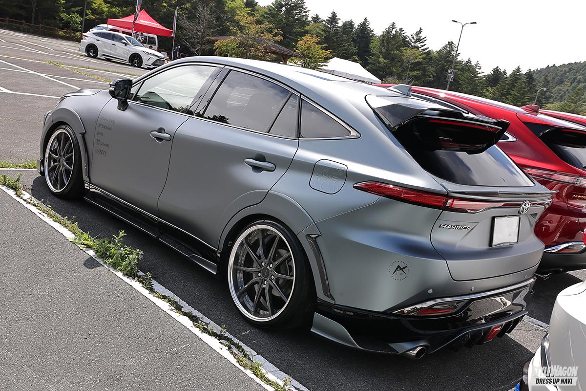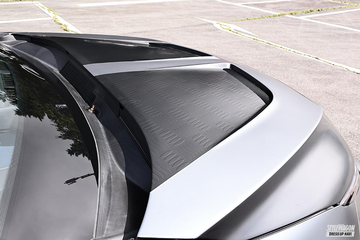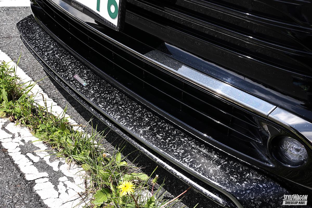 ラッピングにてマットな質感のボディ色に仕上げたなおとんさん。ボンネットには縞板調の演出をしていたり、フューエルリッドには施工店の名称のエンボス処理がしてあったり。バランスよく仕上げられた車高も見どころ満点だし、エアロパーツによる演出も絶妙だったりと、完成度の高さがとにかく光っていた。とりわけボンネットやフェンダーはユニーク。アーティシャンスピリッツ製のソレは、部分カーボン仕様で、カラード部分をラッピングでさらに演出しているのだから。「今は常用仕様で車高を上げている」というから、本来の姿はどんなモノか……、一度見てみたい!