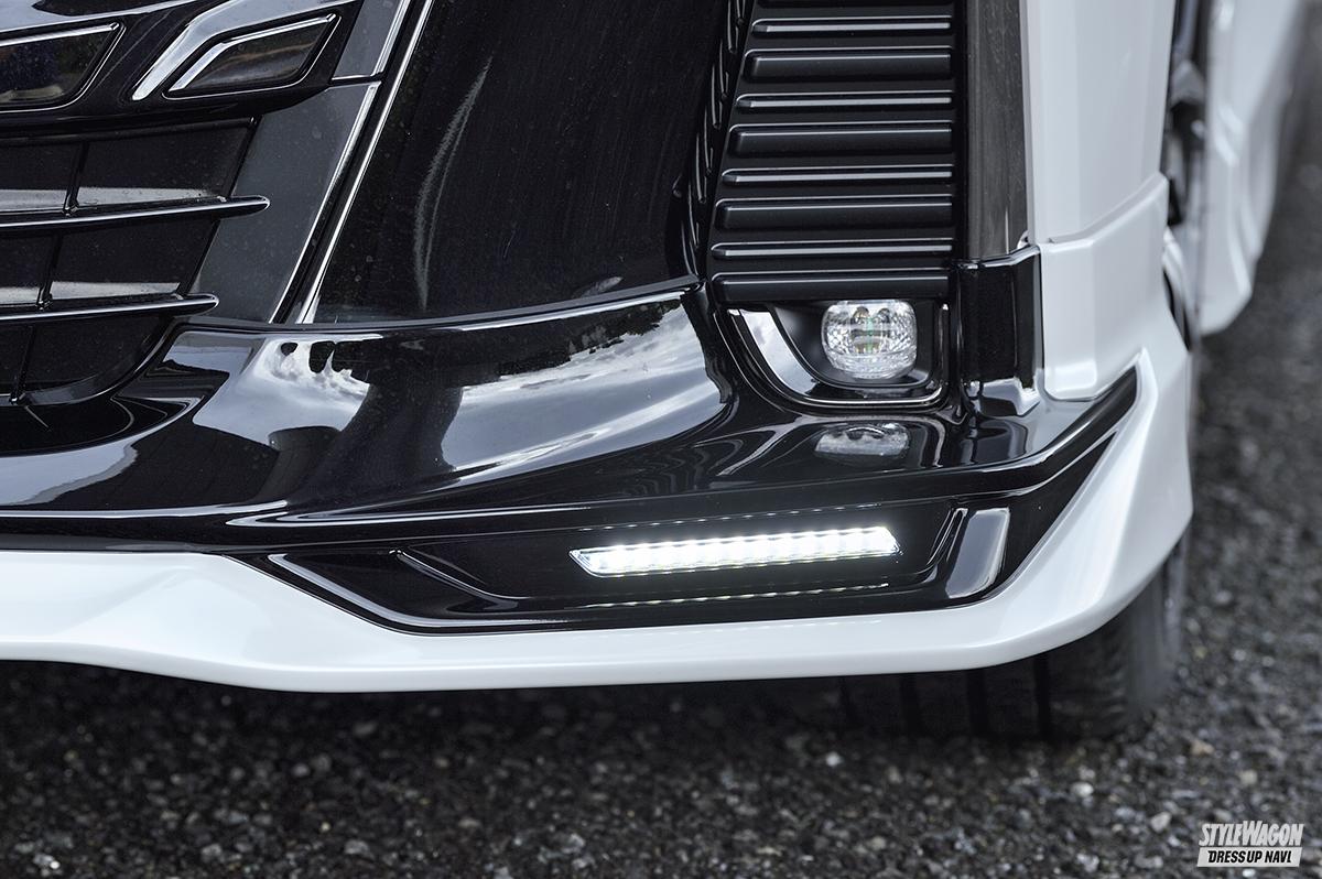 ボディキットは先述のアルファード用「リーガルディグニティ」同様、マフラーまで含めた、エアロ3点のセット販売のみだが、単純な見た目のカッコ良さだけでなく、空力を重視している点も見過ごせない。例えばフロントスポイラーでは、高速走行時に起こりえる浮き上がりや微細な揺れを抑えるなど、ボディキットも1つのパフォーマンスパーツという観点で設計されている。