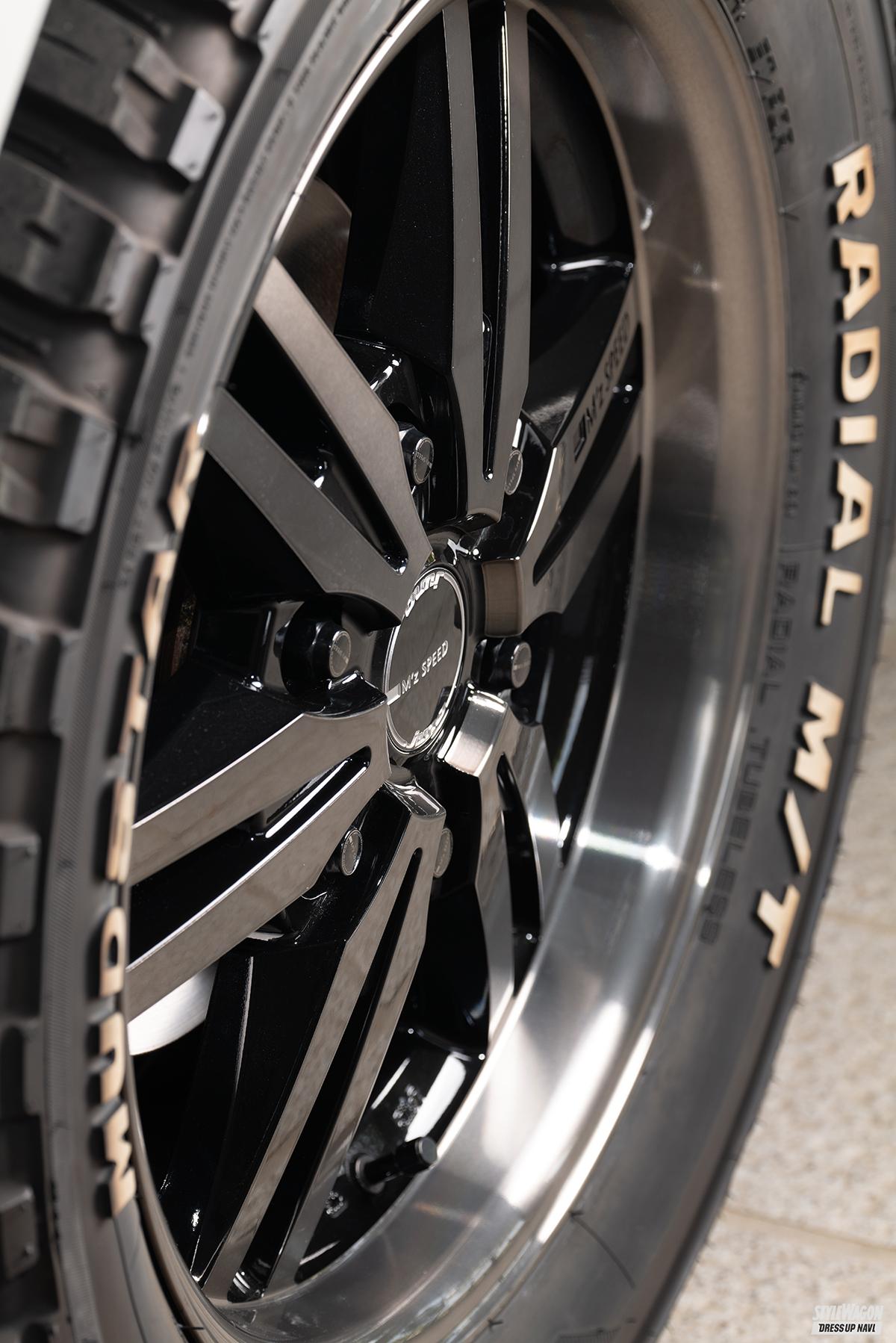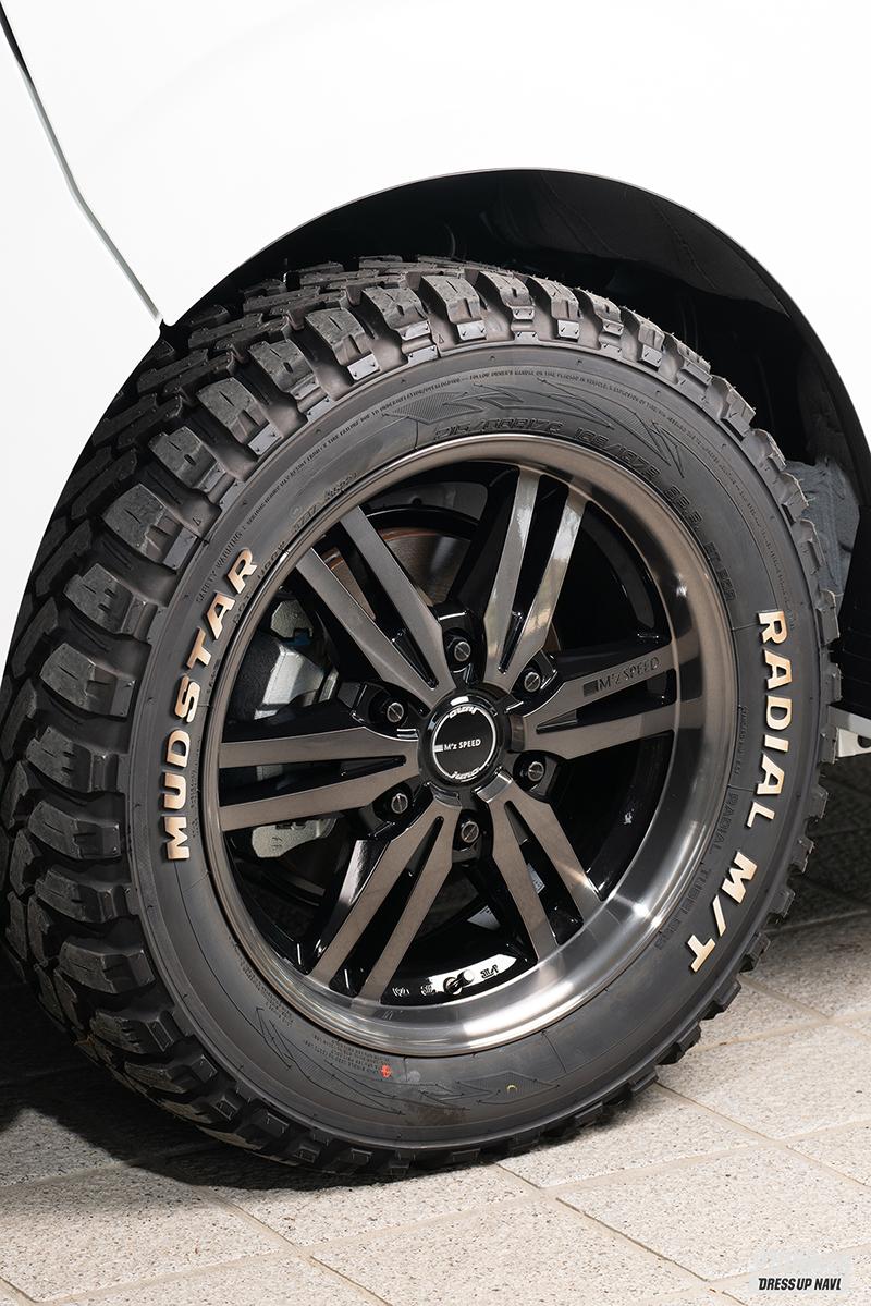 楽器の調律に用いる音叉をモチーフとしたスポークはミステリアスで、キリッとしたストレートラインとやわらかなアールが同居するため高級感がバツグン。スポーク自体は太めだからパワー感もあり、ブロックタイヤとも好相性。ハイエースマストサイズなのも必見。