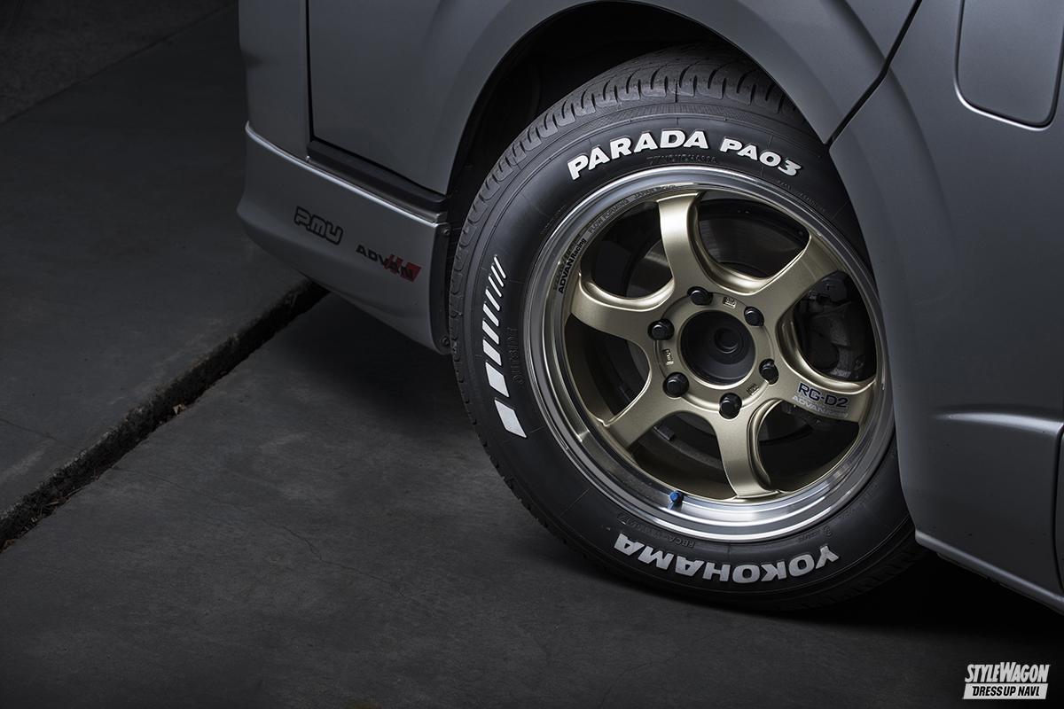 我が国を代表するスポーツモデルを数多く輩出してきたアドバンレーシング。200系に向けてはコチラ『RG‐D2 for HIACE』が設定される。もちろんベースは6スポーク+ステップリムでスポーツカーの足元を支えてきたRG‐D2だ。6Hと6スポークは好相性で足元から一気にスポーティを狙える仕立て。PCD139・7の規格荷重に耐えるべくスポークを太くリファインするなど、性能面もアドバンレーシングの名にふさわしい仕様になっている。銘品のDNAを受け継いだ6H仕様の#200専用品。端的にスポーティ、劇的にハイステイタス。狙わない手はない。