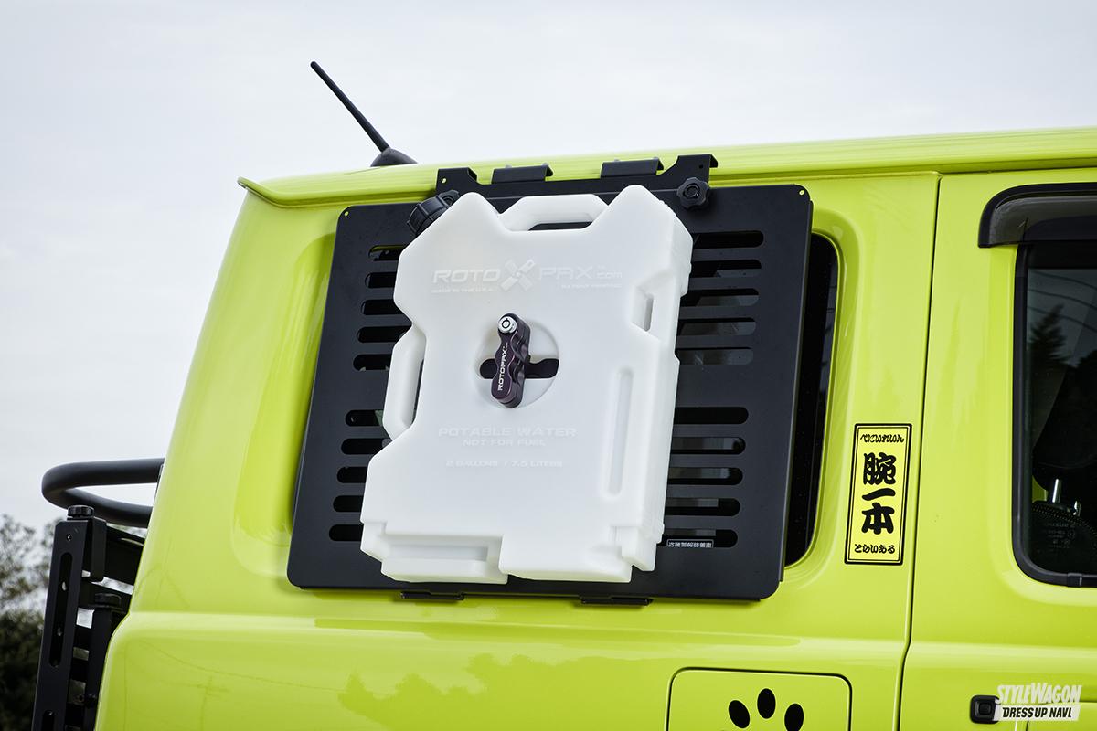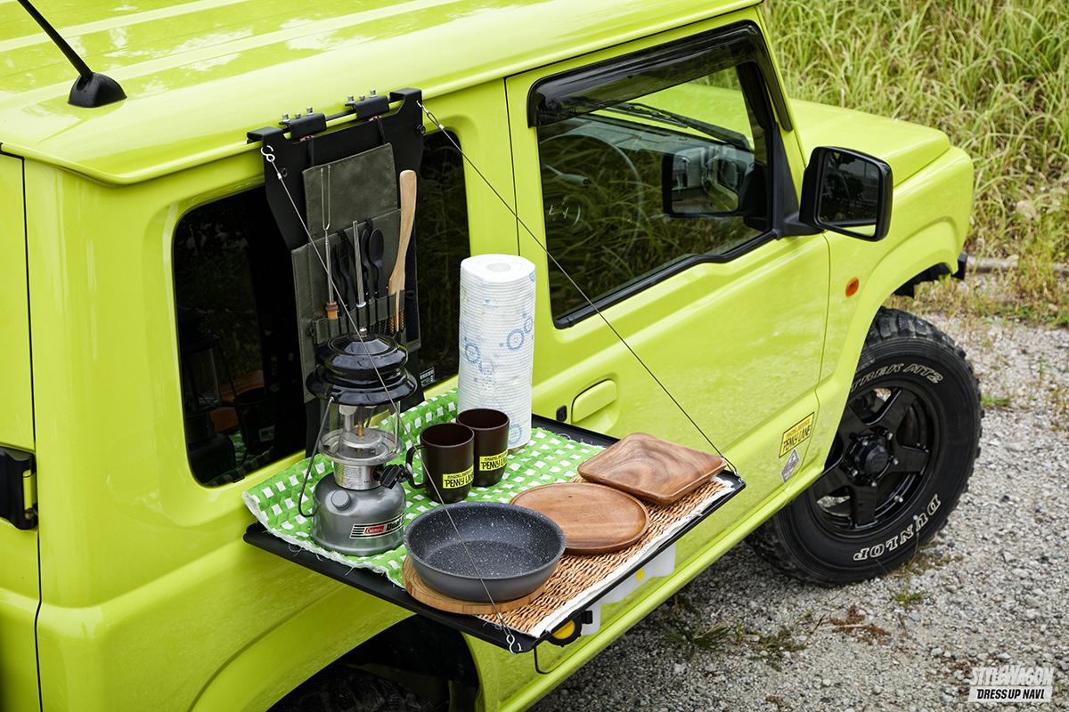 今回の取材時に、クオーターガラス部分に装着するサイドラックがお目見え。最終試験品とのことで、近日発売予定とのことだが、これもかなり良い。ロトパックスなどがマウントでき、手洗い水などの利便性が向上。さらに、展開させることで、調理台やテーブルとしても使用可能。おしゃれだけでなく、リアのスペースを有効活用させつつ、手洗い水などを確保できるのが良い。様々なアクティビティでの使用を、ワイドキャリアとセットで考えるとかなり使い勝手が良いのだ。今から待ち遠しいアイテムだ。