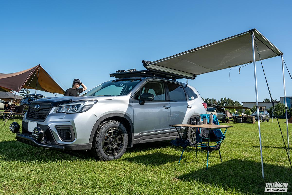 スバルSUVラインアップの大将と言っても過言はない「フォレスター」。スバル純正アクセサリー+サードパーティでルックスを高め、そのどれもがしっかりと実用性を兼ね備えている。どんなフィールドも駆け抜けていく、そんなイメージが、足元にマッチアップされた「トーヨー・オープンカントリーR/T」のコンセプトと120%ピッタリ! 見た目だけ、走り性能だけけでなく、どちらもしっかり確保しながらオリジナリティを出していくという、カスタムの楽しさをまさに表現している1台。こういったキャンプフィールドでの存在感アップはもちろんのこと、普段使いのストリートでも「街オフ」としてその真価を発揮する。