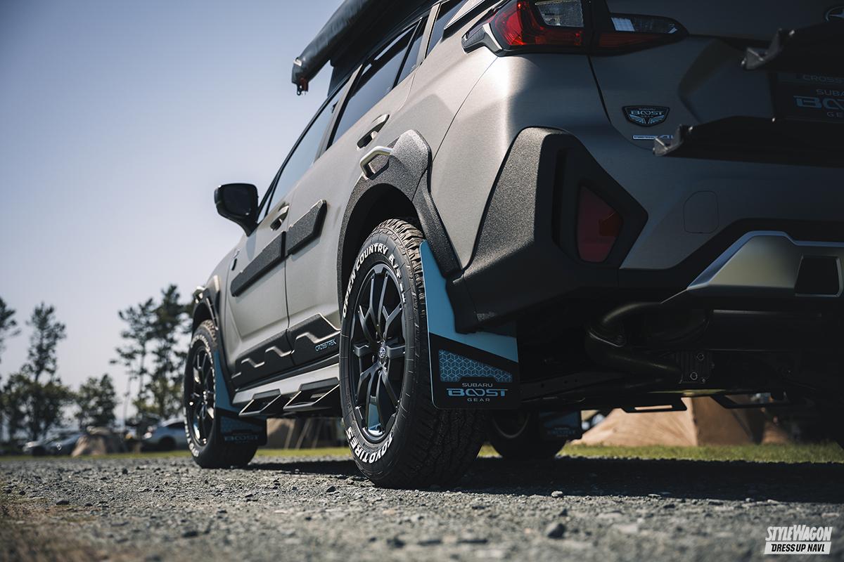 足元にはオープンカントリーA/T EXをマッチアップ。ホワイトレターと、ブーストギアのイメージカラーであるターコイズブルーをアクセントカラーとした17インチホイールが、オシャレなタフネスフォルムをアピール。