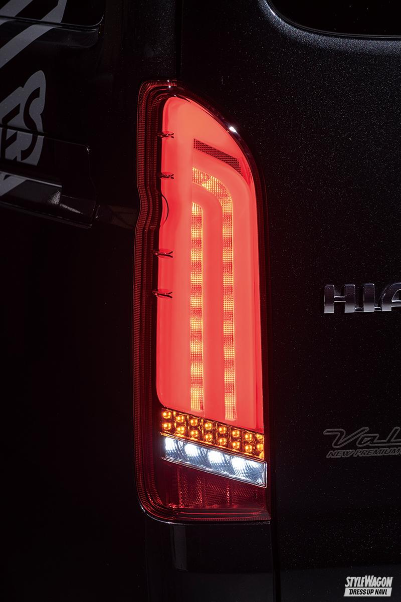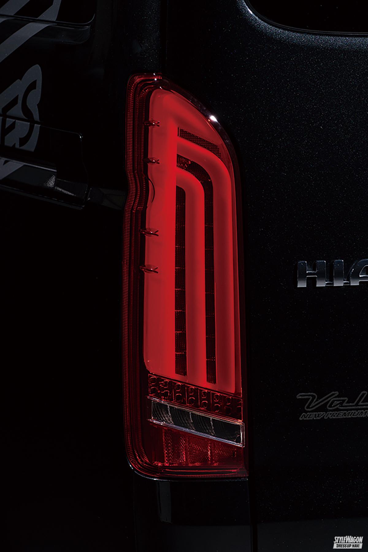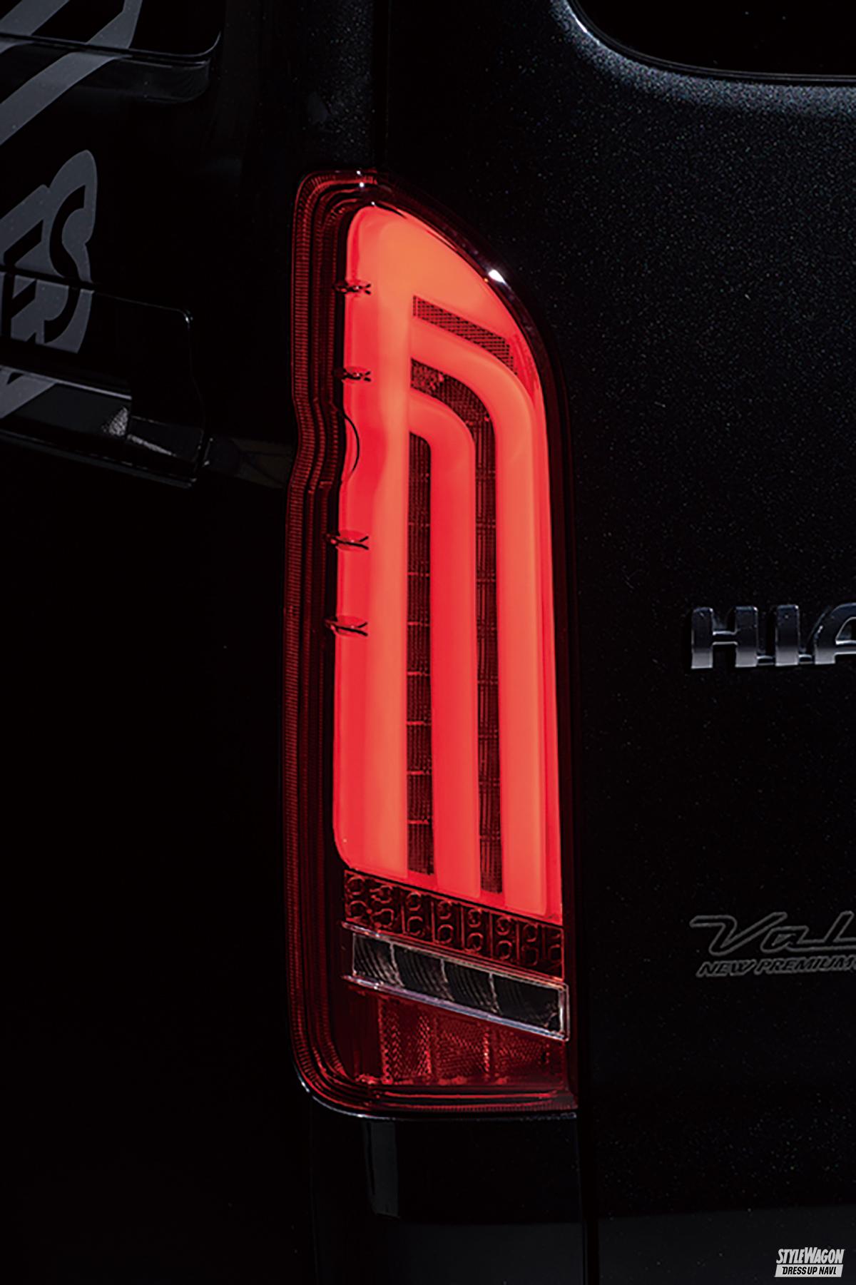 ドレスアップ効果の高いライティングパーツを数多く展開しているヴァレンティ。とくにテールレンズの人気は群を抜く。同社ではテールレンズだけでもこれまでにも複数種類展開してきたが、なかでも完成度とパフォーマンスの高さで話題を集めているのが、この「ウルトラ」シリーズ。オープニング&エンディングアクション(OEA)と呼ぶ機能を搭載した当然のフルLEDモデルで、ドアのアンロック、ロックに連動し、一定時間ヒカリが躍動する、純正テールレンズでは決して味わえないパフォーマンス性の高い機能が備わっているのだ。