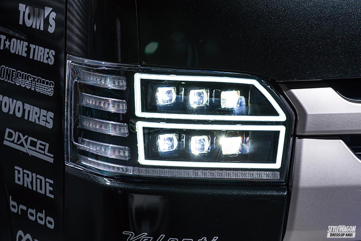 テールレンズ以上にインパクトが強い、上下6灯のLEDヘッドライトは、点灯時は当然、非点灯時の違いも効果テキメン! プロジェクターLEDを上下に盛り込み、それをデイライト&ポジションのLEDホワイトバーで取り囲む。さらに側面と底辺部に、テールレンズでもトレンドとなっているシーケンシャルウインカーを搭載と、純正感を良い意味で完全否定した超個性派仕様だ。見過ごせないのは、テールレンズでも搭載されている、OEA機能が盛り込まれていること。アンロック、またはロック時にヒカリが踊る、パフォーマンス性の高い機能が盛り込まれているのだ!