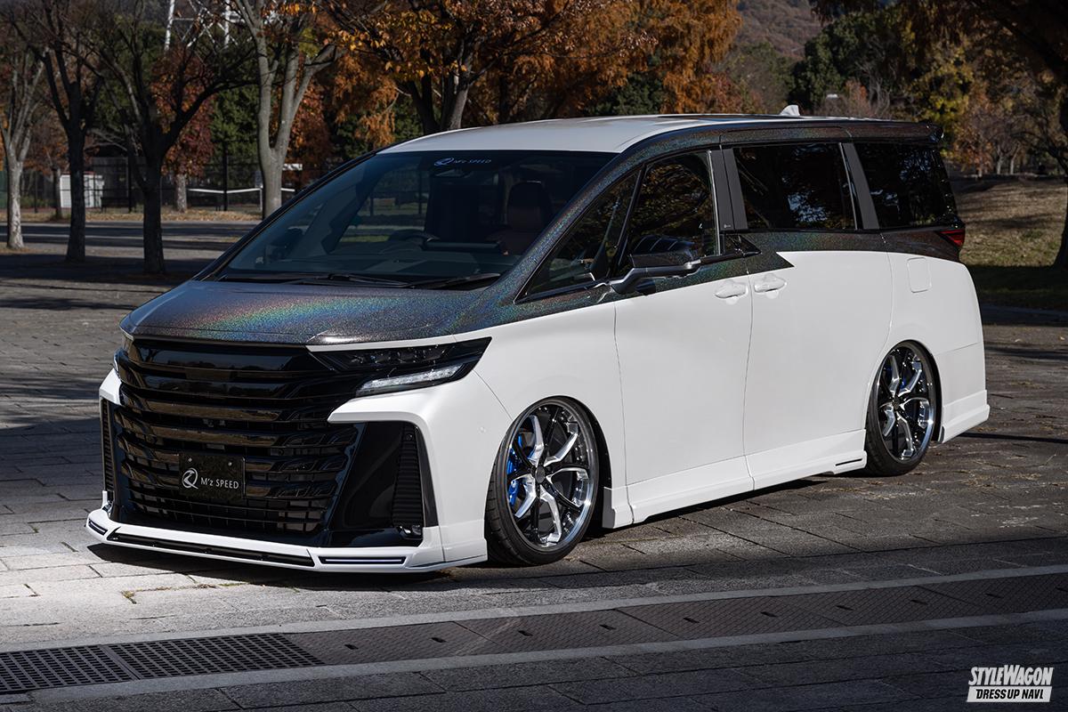 エムズスピードでは新車をベースにあらかじめカスタムを施し、お得な価格で納車できるコンプリートカーの製作&販売にも積極的。もちろん新型アルファード&ヴェルファイアのコンプリートも絶賛受け付け中で、ボディキットやホイール、足まわりなどを含んだデモカー仕様のオーダーも可能だ。中でもラッピングはコンプリートでオーダーする人だけのスペシャルオプション。40系アルヴェルには2種類のデザインを用意している。