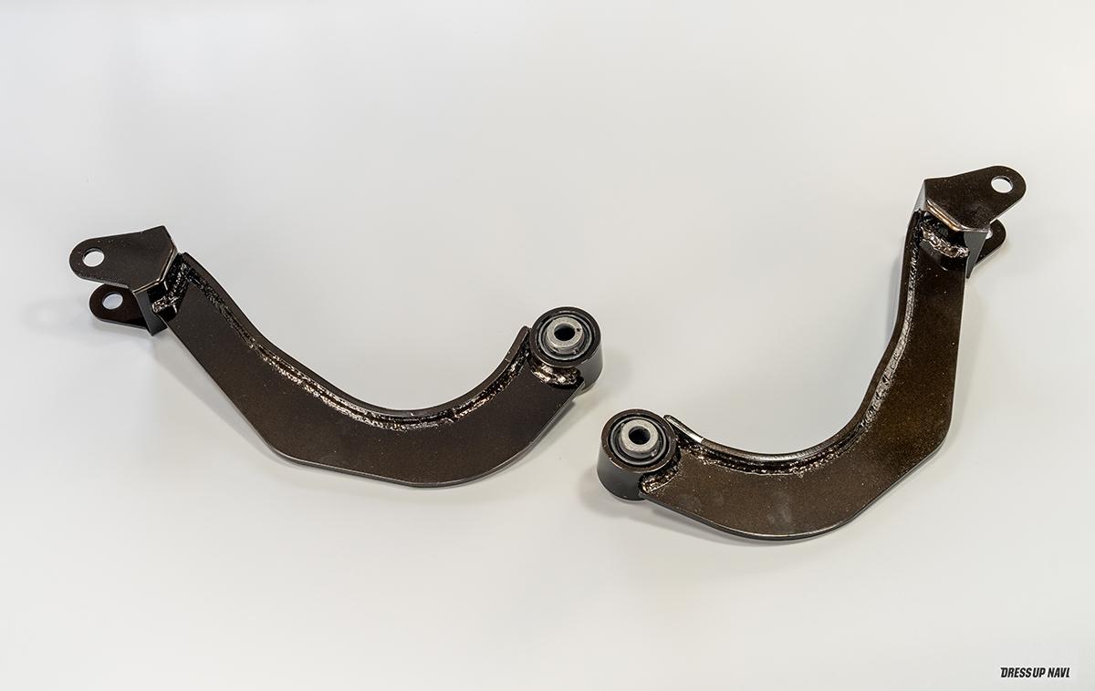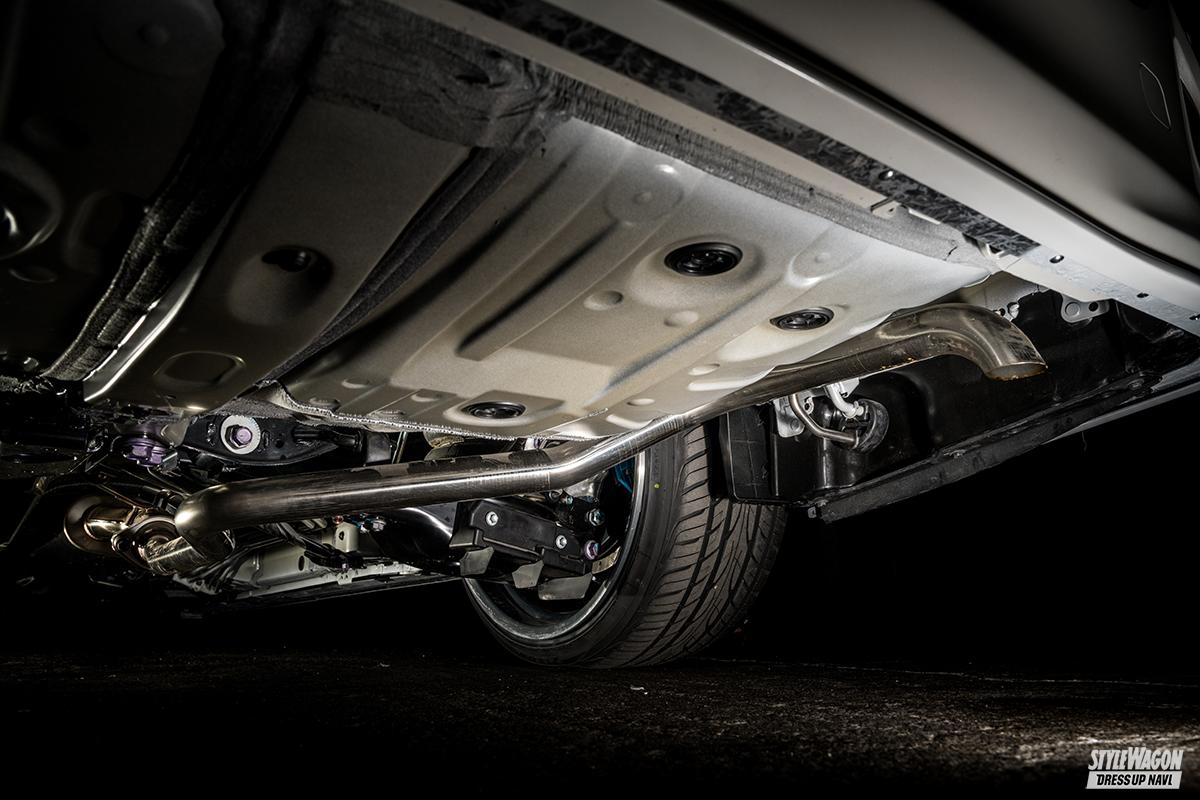 フォルテと言えば、車高短セッティングに定評アリ。ボディキットと同時に、デモカー級の低さを狙えるアーム類3点も、光の早さで設定済みだ。さらに、車高短仕様にうれしい、底上げマフラーを設定。フロントパイプ、中間パイプ、リアピースが用意され、純正より4㎝〜6㎝フロアに沿った形状で、路面ヒットのリスクを低減している。また、中間パイプはバルブの開閉で音量&音質を切り替えられる可変式マフラーもある。