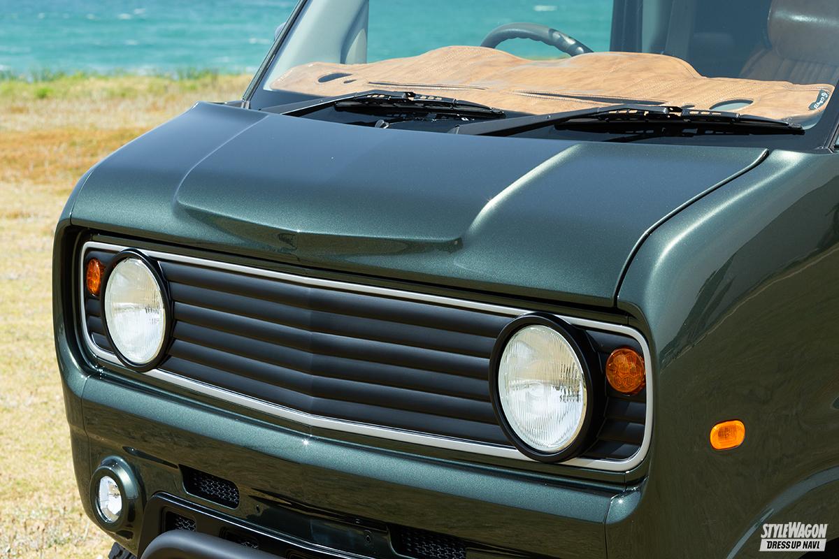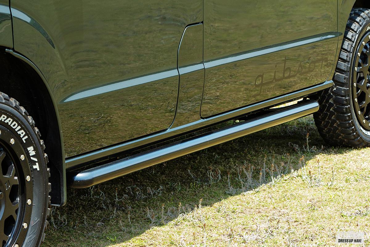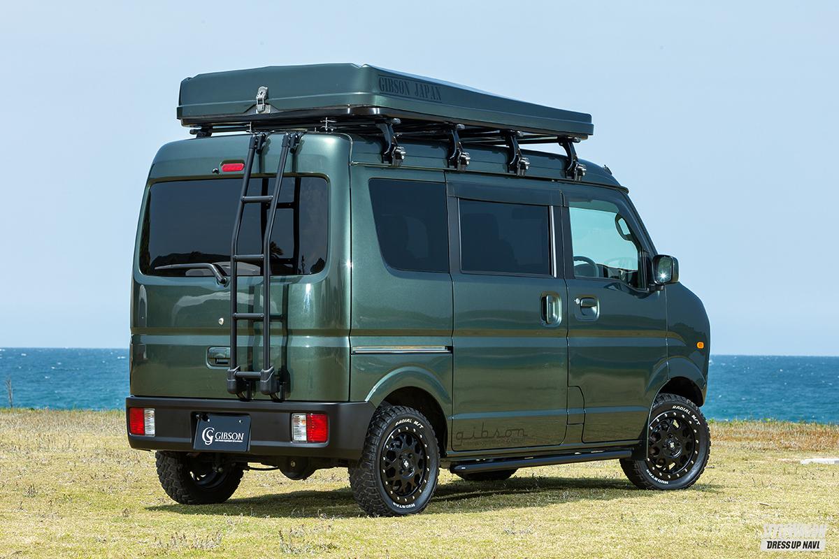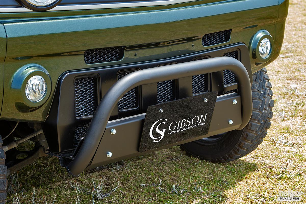 フロントフェンダーまで交換するエブリイマックスフェイスキットは、往年のアメリカンマッスルカーとして今もなお語り継がれる初代シボレー・カマロをイメージ。しかも最終の69年モデルという、ピンポイントな型に着目。発売されてから3年の間に幾度かリファインを実施しているが、特に立体的な横フィン基調の69年モデルは洗練された表情が魅力的。その雰囲気を再現するべく、ヘッドライトも丸型を採用してリアルに造形されたグリルにマッチさせている。ボンネットも専用品に交換することで、グリルを含めセンター部の鋭い尖りを再現することができたのも大きなポイント。そしてアグレッシブなフロントマスクを軸に、ギブソン流のアレンジを加えてオフロードスタイルへと昇華。バンパーガードやスキッドプレート、リフトアップキットとエブリイマックスの魅力を高めてくれるアイテムをズラリと取り揃え、たくましさに磨きをかけることができる。他と被らないエブリイに乗りたい人は要注目!