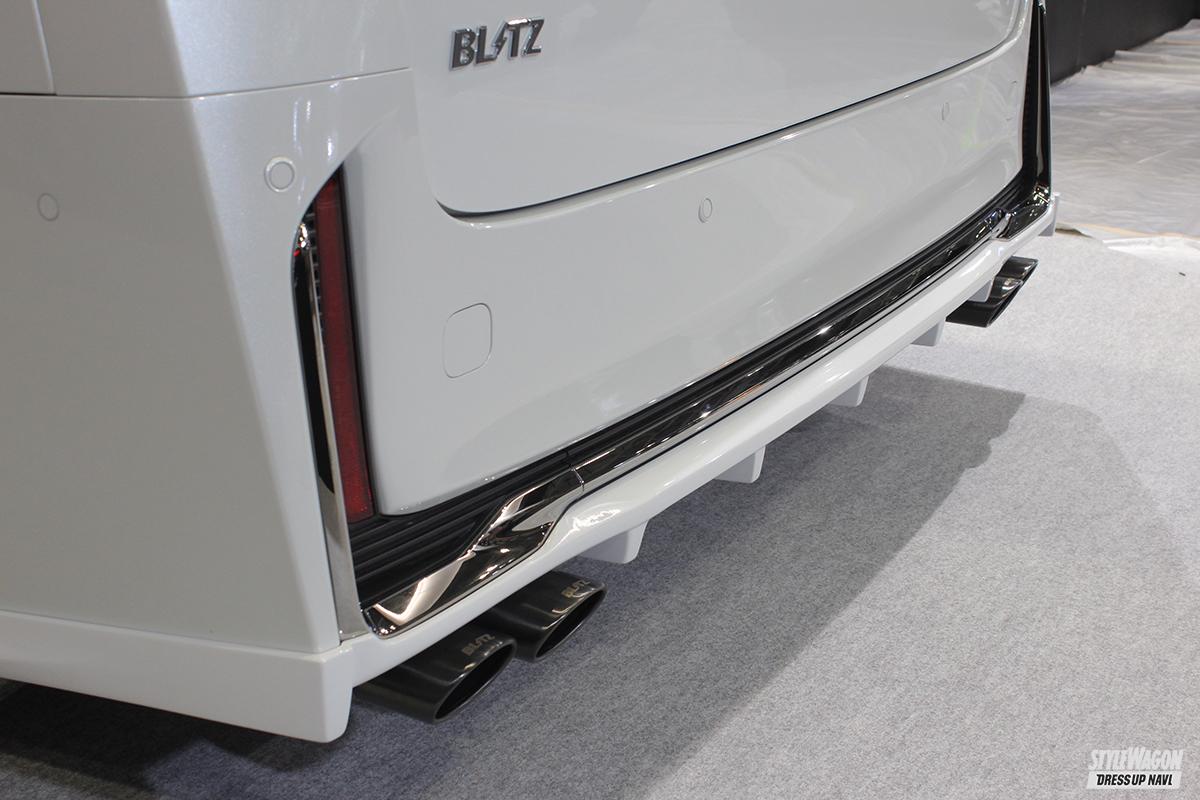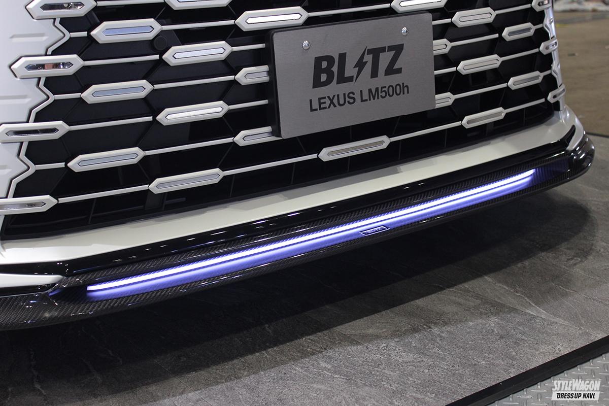 ブリッツだけにまずはローダウンからと思いきや、なんと全身フルカスタムされたLMがお披露目された。圧倒的なオーラを放つマットなカラーリングは、艶消しホワイトによるボディラッピングで、フロントフェイスの象徴であるグリルはメッキを部分的に残しながら同色でコーディネイト。そして前後スポイラーには、リアルカーボンのフラップエアロが装備される。他にもショーカー仕様として、エンブレムやダクト内部をLEDイルミネーションでライトアップしているのだが、今後の展開に注目したいアイテムが、LMの足回りに装着された車高調キット。従来の車高調キット「ダンパーZZ-R」をベースに、スプリング上部に車高の上げ下げを可能にするユニットを設置。タイヤ&ホイールを外すことなく、車高を上げ下げすることが可能となっている。あくまでもプロトモデルということだが、今後の商品化に向けてぜひとも注目したいアイテムだ。