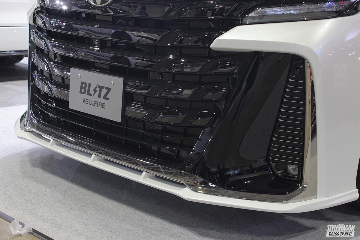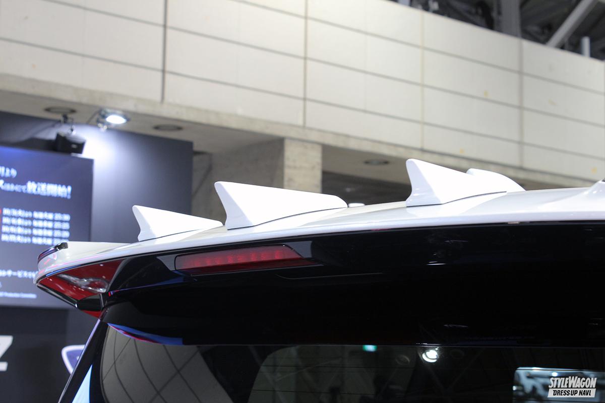そんなLMと並んで展示されていたのが新型ヴェルファイア。車高調キット「ダンパーZZ-R」でローダウンし、前後スポイラーにはスポーツ感を底上げするフラップスポイラーを装備。フロントは純正バンパーとの設置面にダクトを設けることで、アグレッシブなムードを底上げしている。純正リアウイング上に設置する小型の3連フィンも注目したいアイテム。今回はヴェルファイアのみの展示となったが、アルファードも間も無く完成予定とのこと。