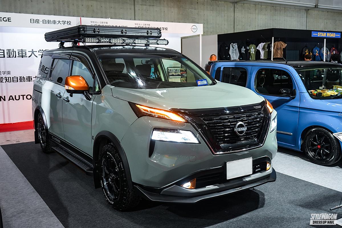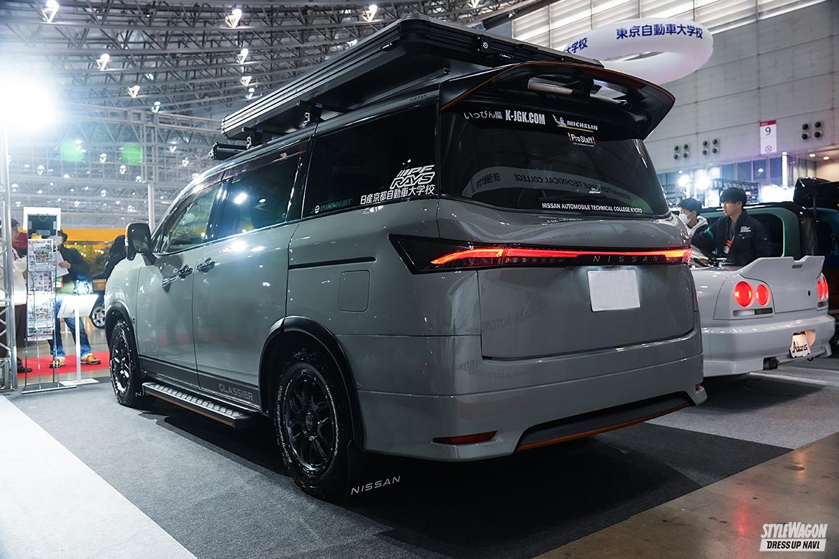 カスタマイズ科4年生全員で製作にあたり、約6カ月で完成させた。新型エクストレイルフェイスのE52エルグランドは、ワンオフの4インチリフトアップ、BFグッドリッチオールテレーンタイヤ&レイズホイール、LOSSルーフテント、IPFライトを装着。ボディカラーは「朝焼け」をイメージし、青味がかった雲に日の出のオレンジにペイントしている。