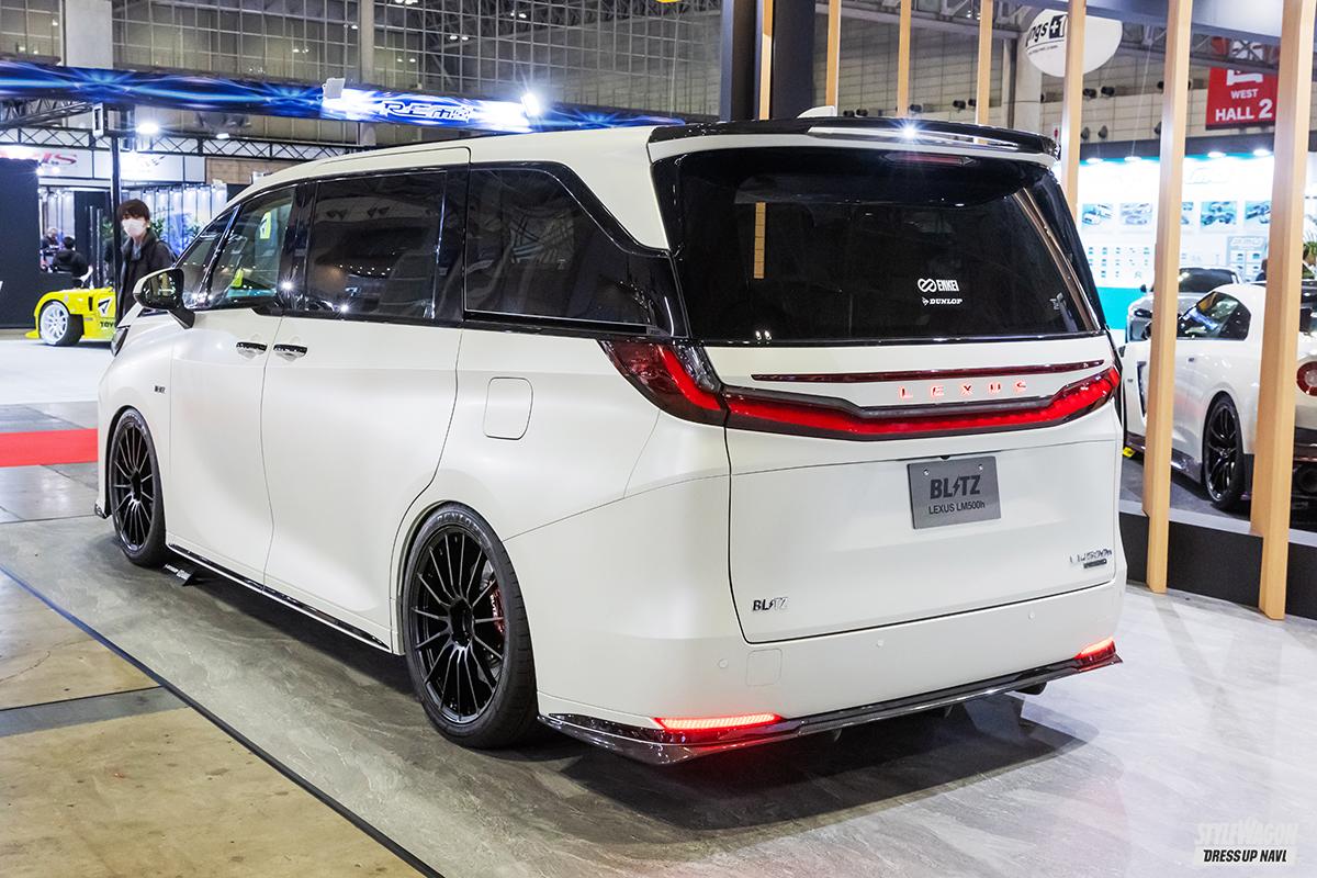 2000万円という高価格ながら、納車時期未定の引っ張りダコ状態にあるレクサスLMを、老舗チューニングブランドのブリッツが大胆にモディファイ。何と言っても目を惹くのがレインボカラーに輝くフロントグリル。これはそのものズバリ「ブリッツ・グリルイルミネーション」という装備で、ハニカム形状のブロック内の一つ一つにRGB-LEDを内蔵。小型のコントローラーを操作することでカラーや明るさの変更が可能。残念ながら現時点ではショーモデル用の参考出品とのことだが、LMの特徴的なグリルデザインを活かした斬新なアイディアは大いに反響を呼びそうだ。その他、一見、純正風に見えるホワイトの車体はラッピングによるもので、インテリアには鍛金と呼ばれる技法による作品で知られる金属工芸家、木寺由布子氏が手がけた装飾パネルを採用。さらにエンケイの最新21インチホイールが投入された足回りには任意で約30mm車高をアップさせることができるリフターの内蔵に加え、運転席と後部座席の両方から減衰力調整が可能な車高調、ZZ-Rエア・スペックDSCプラスを装着。見た目、走り、室内空間の快適性というすべての面において最上級レベルを目指した創意工夫が具現化されている。