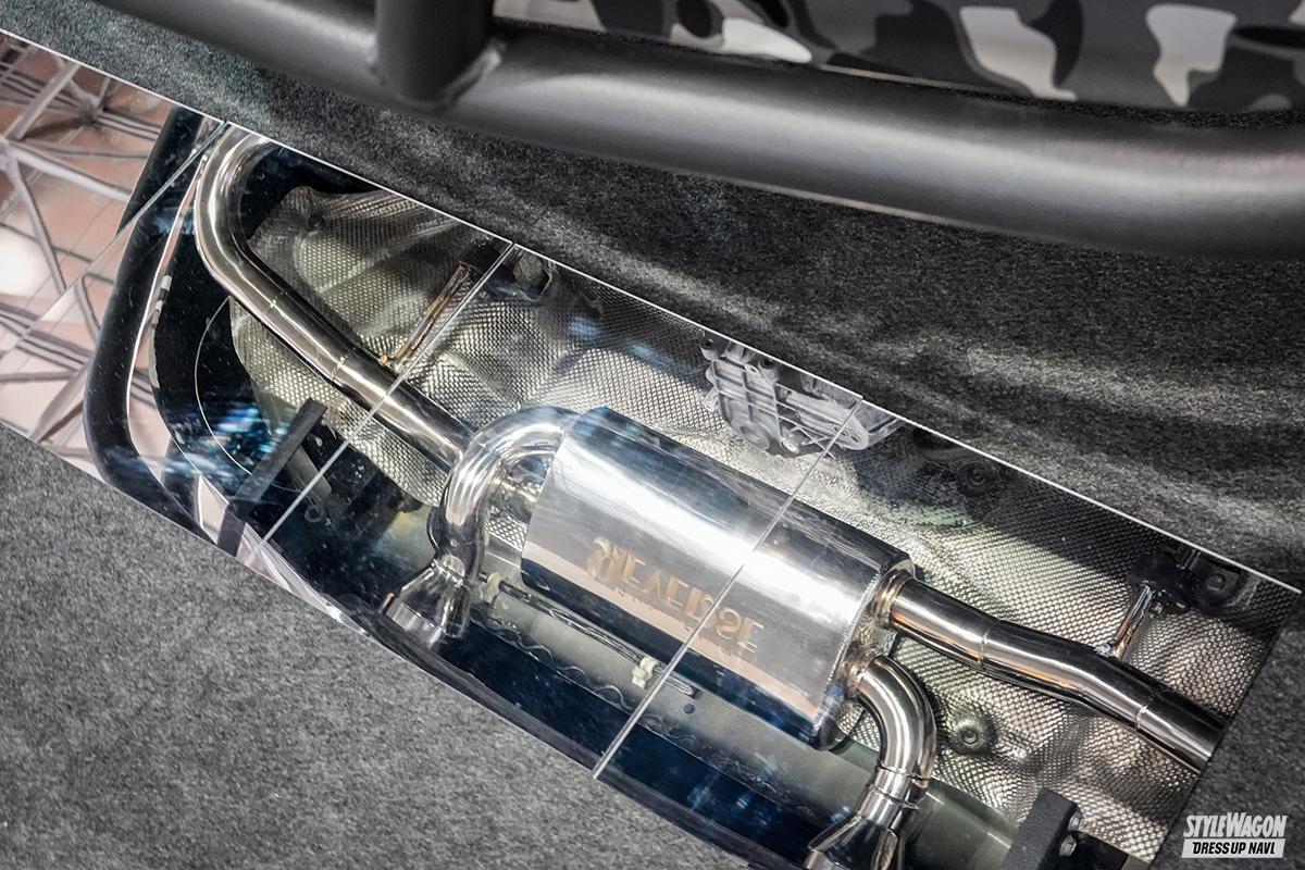 カムフラ柄のボディラッピングやバンパーガードでワイルドにキメたエクステリアが、カタにとらわれない奔放なカッコよさを放つこの1台。肝心の足回りのリフトアップはフロントストラットをブロックで延長し、各メンバーにスペーサーブロックをレイアウト。RR駆動のエンジンもマウントブロックでリアアクスルごと搭載位置を下げることで、ノーマルアライメントの維持とドライブトレインへの負担を軽減した70㎜の車高アップを実現。本来の走行性能と乗り心地を損なうことなくオン/オフ両用のスポーツドライビングを可能とした。完全専用設計のこれらリフトアップパーツはZEALからキット販売の予定で、バンパーガードやアンダーガードのほかステンレスマフラーもオーダーメイドでワンオフ製作を承るのこと。