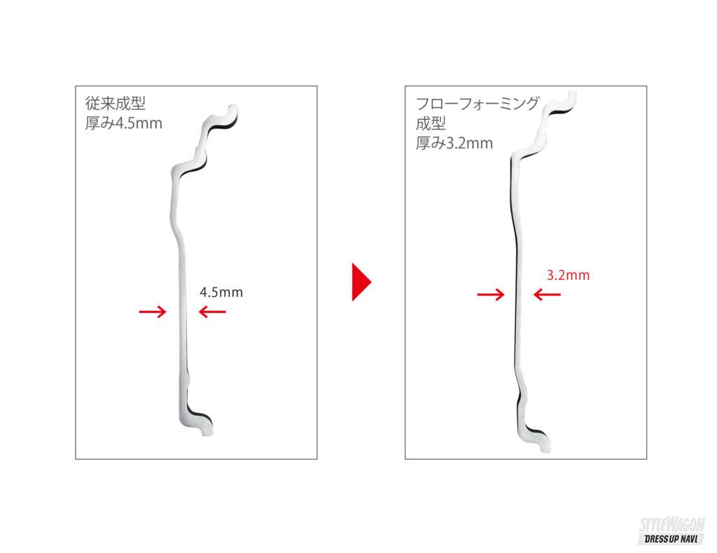 ホイールの製造方法は、鋳造と鍛造の2つに大きく分けられるが、近年注目されているのが「フローフォーミング製法」。鋳造で成型したホイールのリムを、スピニングマシンなどで強い圧力を加えながら成型することで、鍛造ホイールのような軽さと高強度を実現した製法。鍛造製法よりも製作コストを抑えられるうえ、鍛造に近い剛性を手に入れることができる。ホイールメーカーによって呼び名は若干異なるが、基本的な製造方法は同じ。