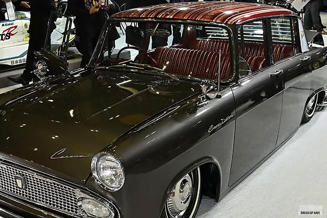 今回が11回目のオートサロン出展となる花壇自動車大学校は、1997年式のC23、初代セレナをカスタマイズ。そのベース車がFRレイアウトの5速MT車で、シルビアなどに搭載されていたSR20エンジンを採用していたことから、映画「ワイルドスピード」をモチーフとしたシルビア風のスポコン仕様を完成させてきた。フロントバンパーはS14シルビア前期用で、ローダウンしづらいことで知られるC23セレナをワンオフの足まわりでベタベタに。オーバーフェンダーもワンオフで、フロント9J、リア9.5Jというあり得ないサイズの極太ホイールをセットしているのも必見だ。スカラベをテーマとしたカスタムペイントの質も極上。室内はスパルコのロングスライド加工で4人乗り化。