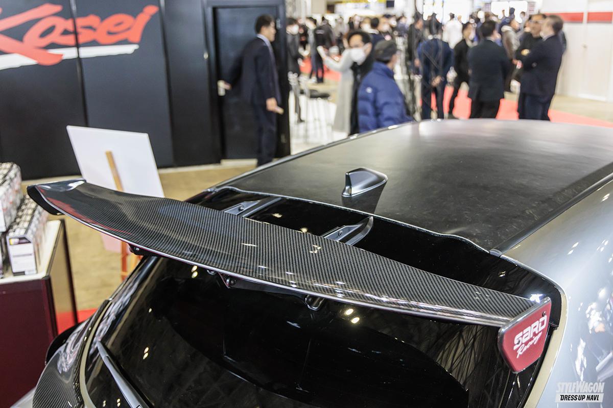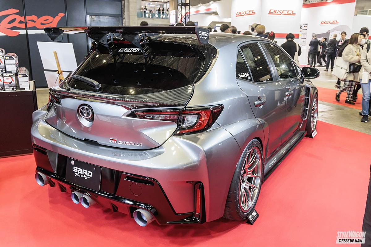 サードがお披露目したのはGRカローラ用ボディキット。これまでのレース活動で得たノウハウを余すことなく取り入れる、がテーマとなった一台で、レーシングチームであるサードとしての原点に回帰したフィニッシュとなるのがその特徴だ。空気の流れを味方につけた機能的意匠が魅力で、2段ディフューザー風なフロント、ガッツリとワイドなフェンダーダクトなど攻撃力は全開。フルチタン製マフラー、GTウイングも迫力。