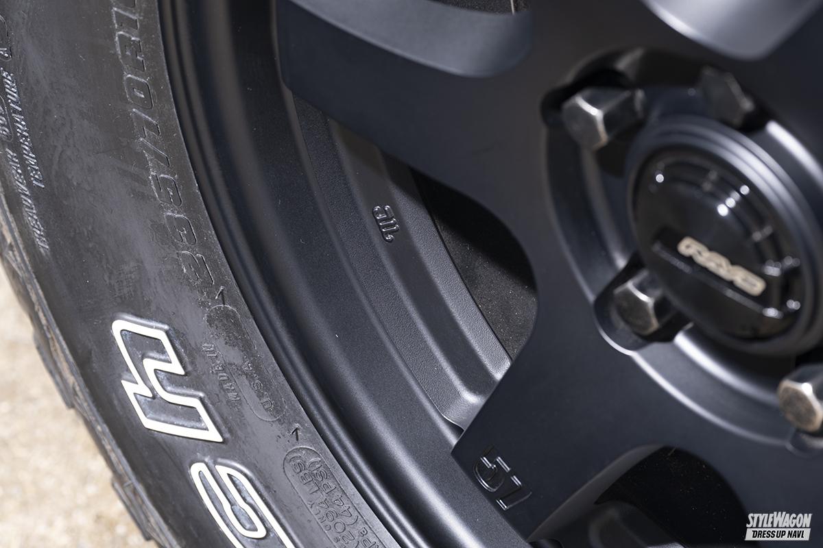 ボディマスの大きなデリカにマッチする太く堅牢なスポーク。低圧でのオフロード走行に対応するべく、ビードシート部にはローレット加工が採用される。スポーク天面はエンボスロゴ入りで、所有欲を満たしてくれるのもうれしい。また、今作は“R”シリーズで初となるセンターキャップ付属仕様。スポーティ&パワフルな装いに、ドレッシーな要素もプラスされた。
