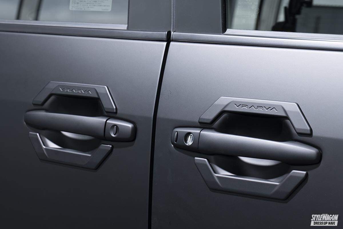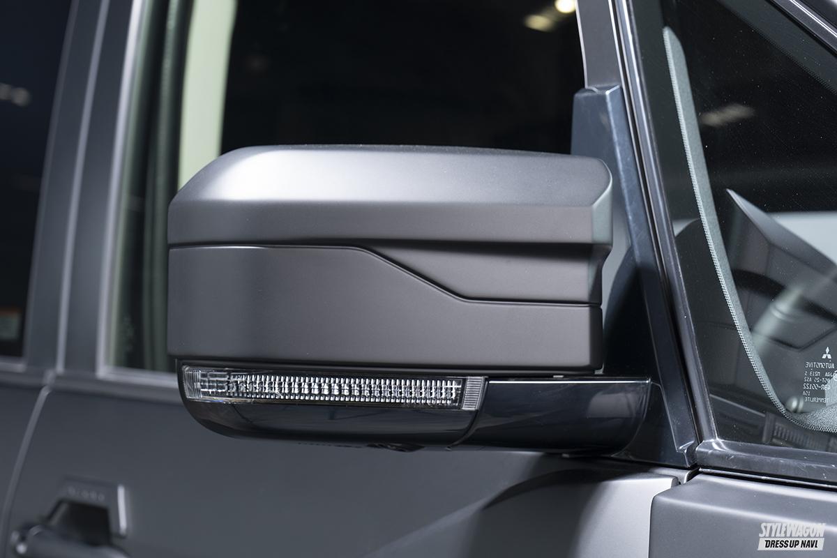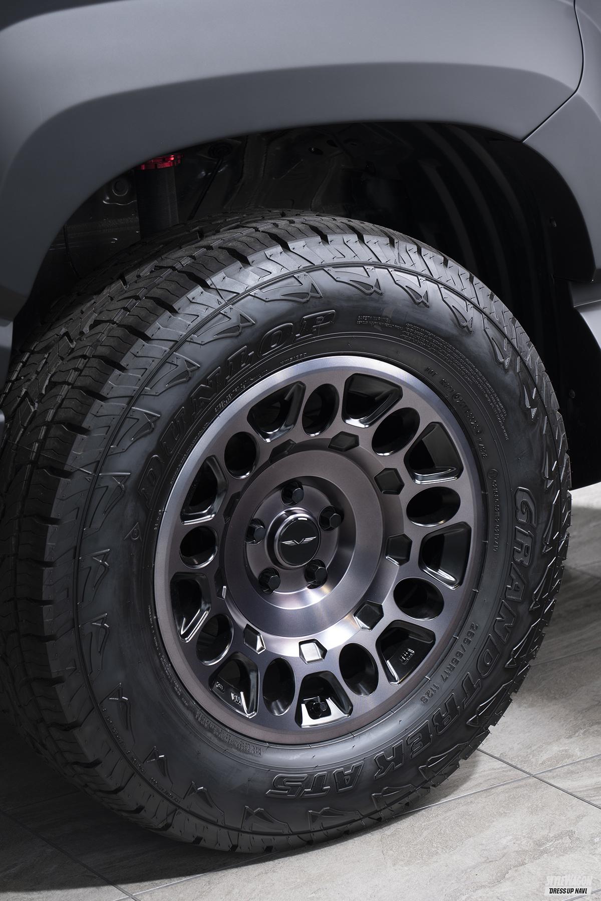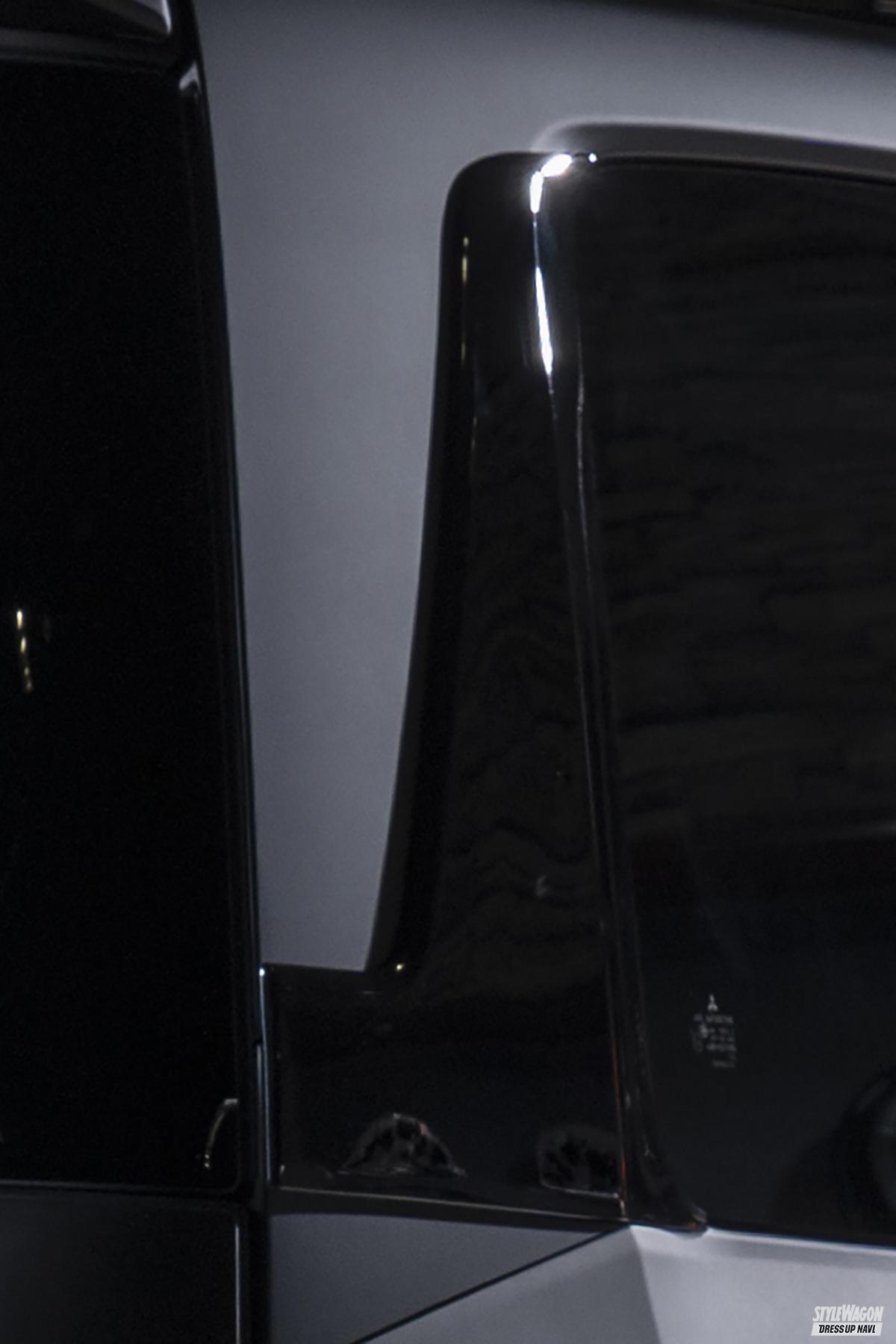 そんなブラーバの第2弾として世に送り出されたのが、D:5をベースとしたこのオーカス。ブラーバならではの近未来感が全開だ。フロントマスクはライト類こそ純正だが、それ以外のパネルはすべてオリジナルに変更。メカニカルさを重視した押し出しの強い面構成となるのが特徴で、フロントバンパーは純正よりもショート化されており、オフロード走行時のアプローチアングル確保にも配慮されている。大きな抑揚を持つボンネット、逆スラント形状となる近未来感絶大なグリルも印象的。前後ともに片側30㎜ワイドとなるオーバーフェンダーも、適度に角張った造形とすることでミリタリー風味を醸し出すなど絶妙だ。