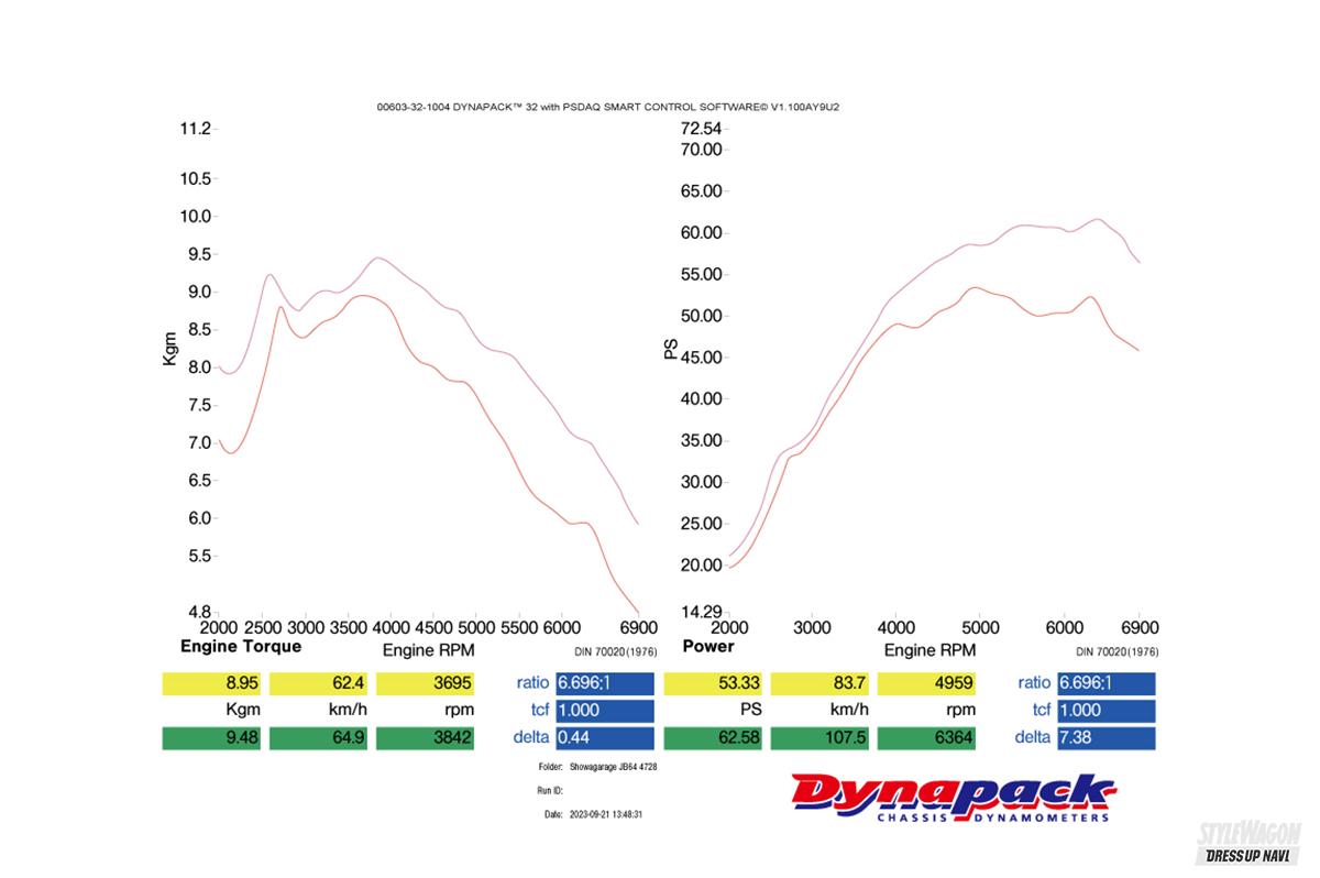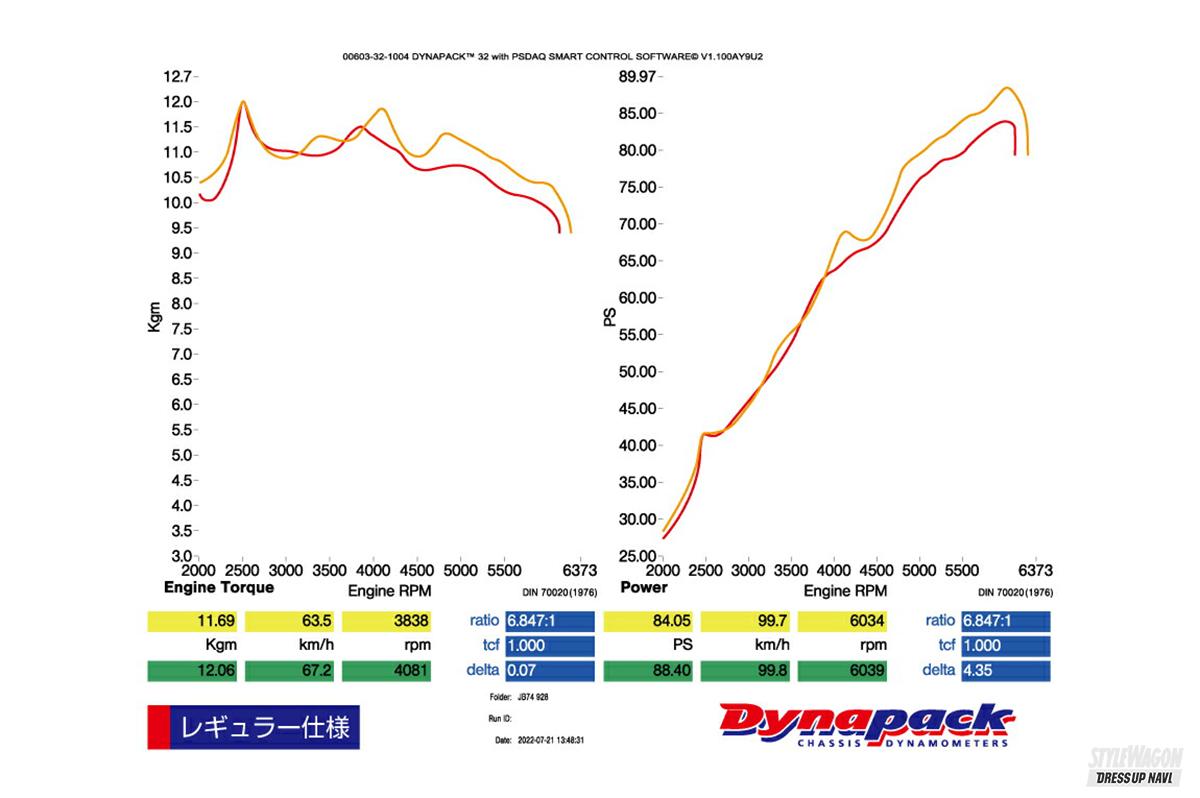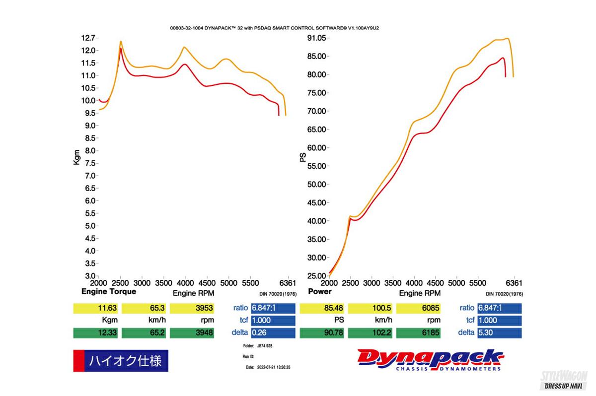しかし、伊神氏が最も気を使ったのが、普通の人が普通に使う際の、パワーバンドの入り始めまでの特性だ。実はこの領域はパワーアップしにくい。ターボ車の最大の武器であるタービンが性能を発揮する前となるからだ。さらに、そこの繋がり部分が唐突だと普通の人は乗りにくさを感じてしまう。いかにスムーズにパワーを出し、扱いやすく感じるフィールにできるか? が特に難しかったのだそうだ。ここの部分がしっかりとパワーアップしていれば、タイヤを大径化した際、クラッチミートが容易となり、そこから気持ちよく回転を引っ張り、キャンプ用品などを満載した状態でもしっかりと加速できる。具体的な目的意識を持ってECMセッティングを行っているのだ。