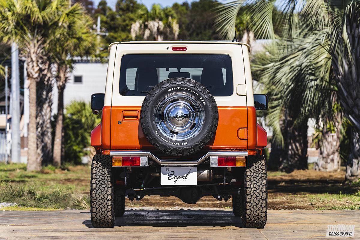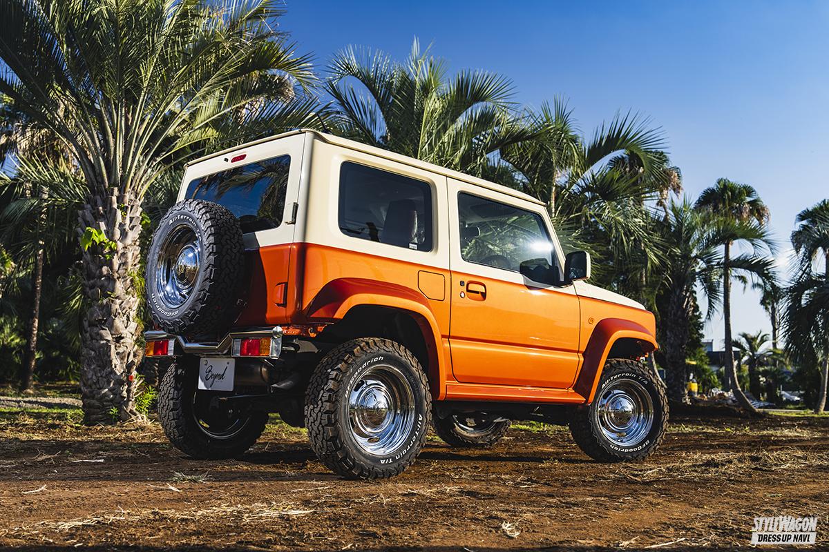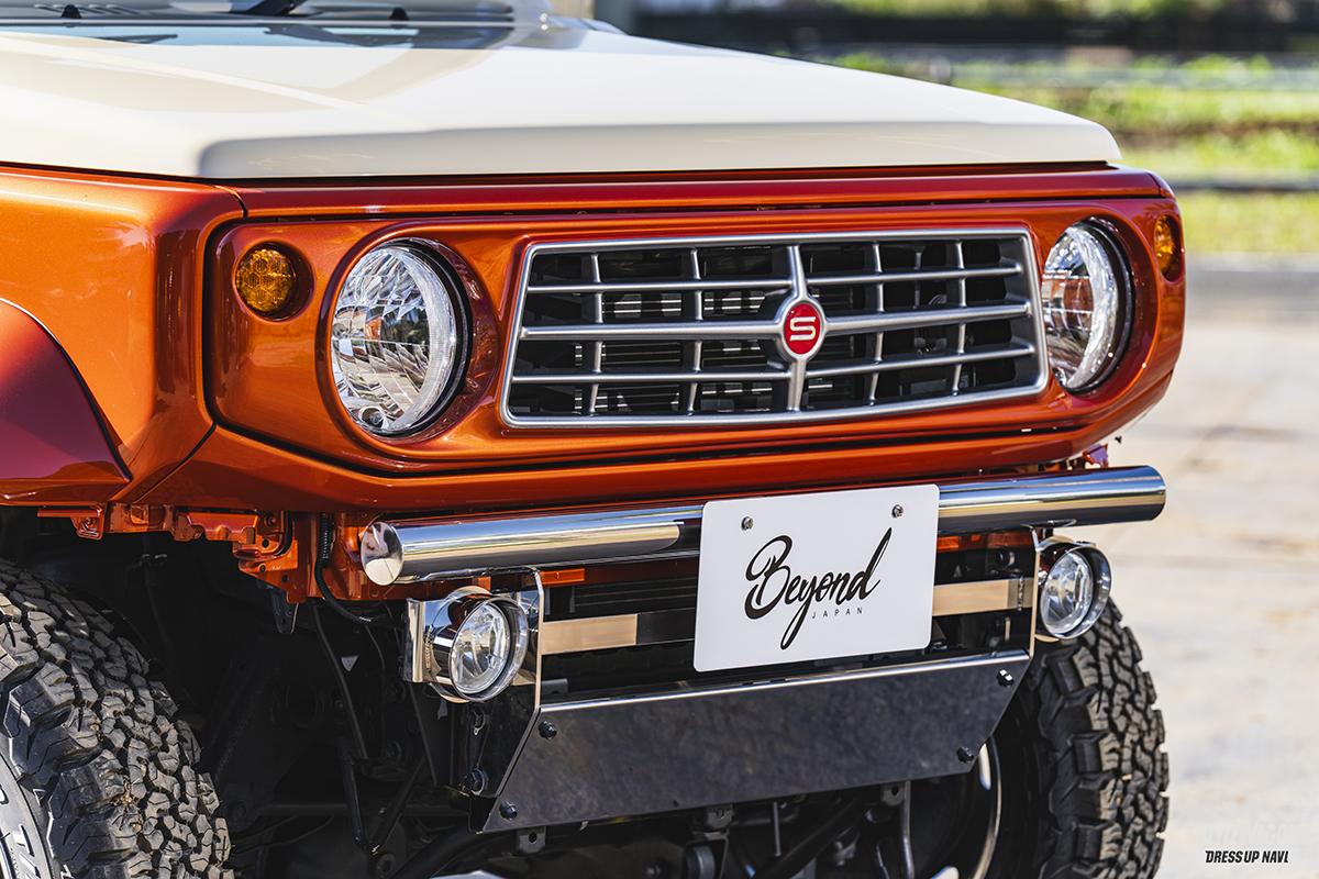 ビヨンドジャパンは昨年誕生した新進気鋭のジムニー専門パーツメーカー。すでに多くのアイテムをリリースしているが、今回紹介するのは古き良きアメリカンスタイルを彷彿とさせるスタイリング。ジムニーカスタムの定番であるショートタイプのパイプバンパー、リベルテフロントバンパーはピカピカに磨き上げられた鏡面タイプ。無骨でワイルドなデザインとの相性も良く、オフロードよりもカスタム色を強めたいユーザーに最適なアイテム。フロントは本体のみ、フォグステー付き、スキッドプレート付き、フォグステー&スキッドプレート付きの4種類を用意しており、予算や好みに合わせて選べる。もちろんリアバンパーも鏡面仕様を設定している。
